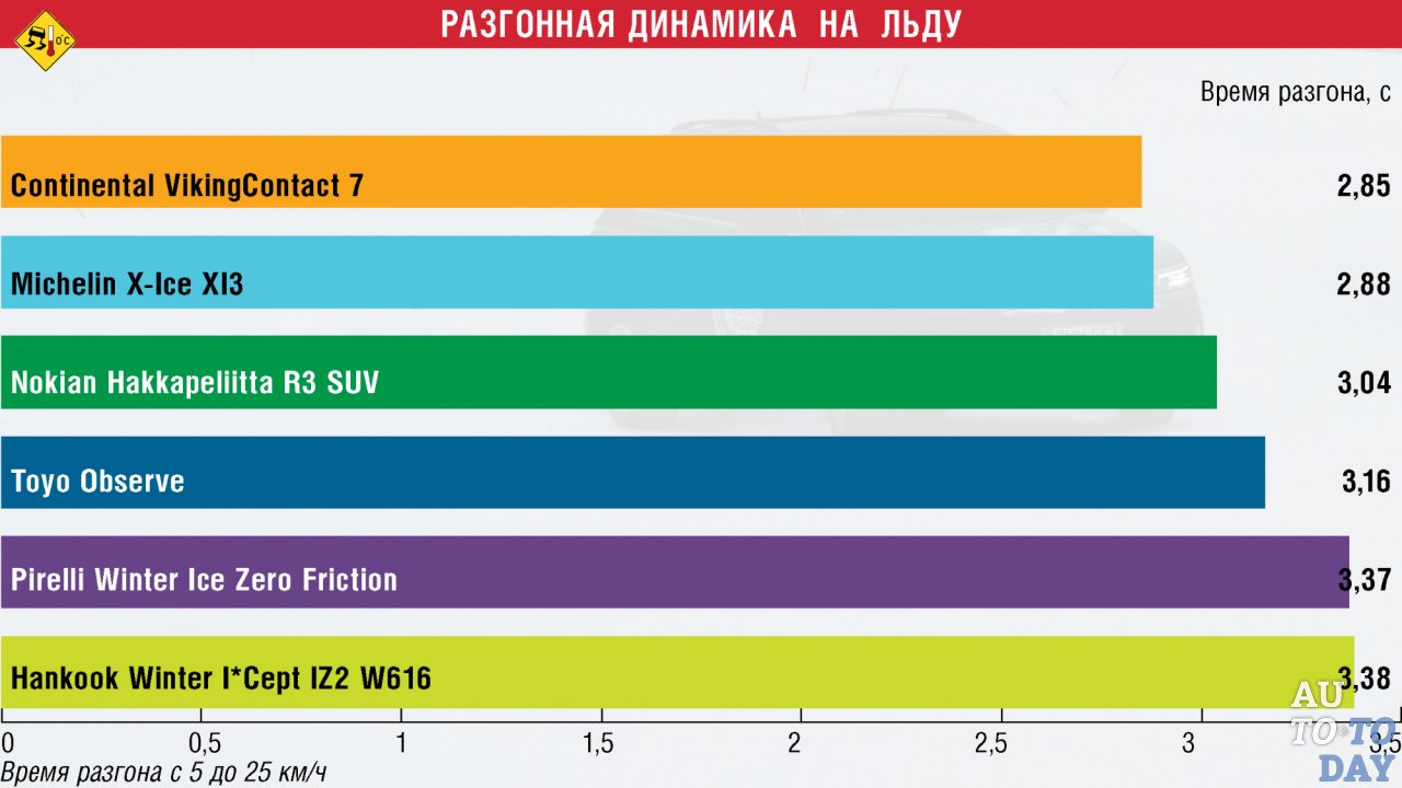 В данной группе шин модель Continental Viking Contact 7 на льду обладает наилучшими тормозными свойствами, цепко держится за дрогу в поворотах и обеспечивает прогнозируемое поведение на льду, давая возможность исправлять ошибки при превышении разумной скорости. В разные ледовых тестах эта шина показывает высокую скорость прохождения трасс, что подтверждает хорошие сцепные свойства с ледовым покрытием. На снегу маневры на шине Viking Contact 7 могут сопровождаться сносами колес передней оси (недостаточная поворачиваемость), но в целом она позволяет ехать быстро и обеспечивает точные реакции при маневрах и прогнозируемое поведение автомобиля.