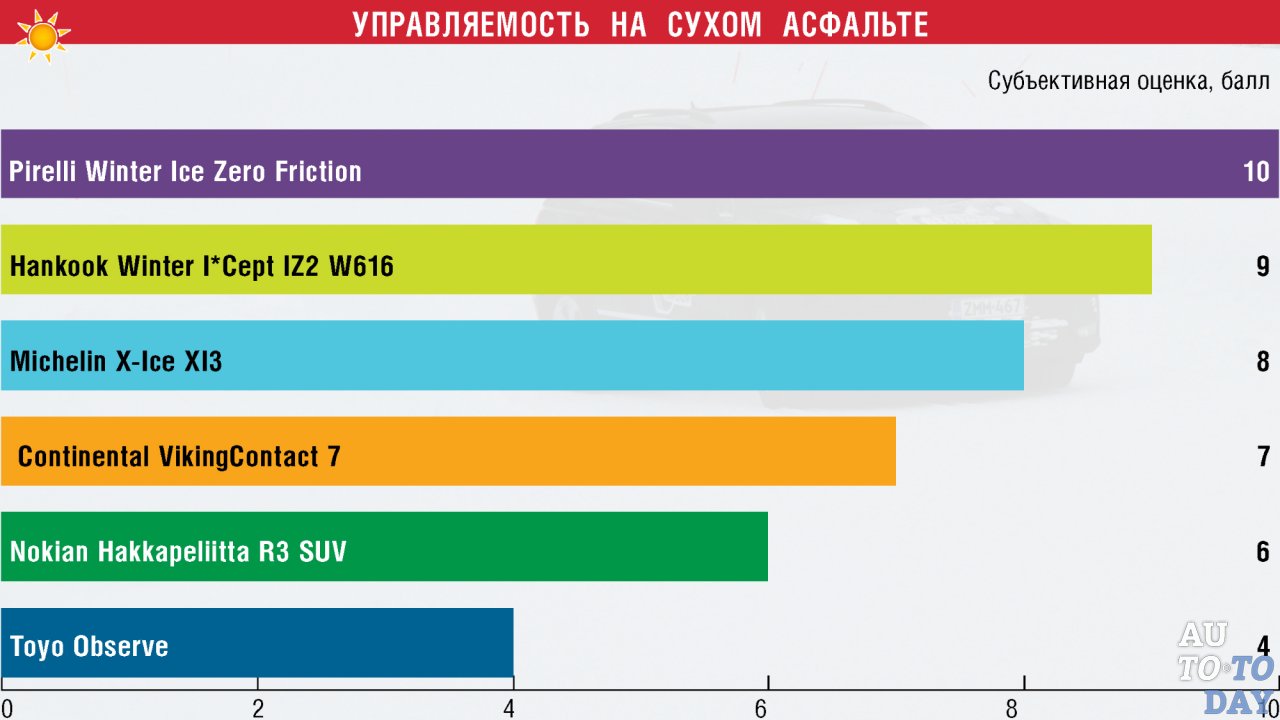 На мокром асфальте Winter Ice Zero Friction в целом получила достойные оценки, но все же требует аккуратности и контроля скорости, так как при резких маневрах возможно появление как сноса автомобиля, так и его заноса. По тормозным свойствам здесь она в тройке лучших. На сухом асфальте эта шина самая лучшая в этом тесте по уровню обеспечиваемой управляемости, прогнозируемости и стабильности поведения. Хотя по тормозным свойствам уступает нескольким моделям.