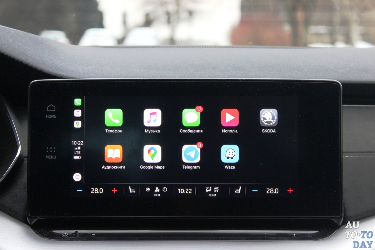 Мультимедийная система Columbus с 10-дюймовым дисплеем в топовом исполнении имеет штатную навигацию, встроенную SSD- память на 64 ГБ и многое другое. Но самое удобное – это поддержка беспроводного Apple CarPlay. Теперь даже телефон не нужно из кармана доставать, и машина по вашей просьбе зачитает вам непрочитанные сообщения в «Телеграм». Настраиваемая подсветка, добротные материалы в отделке, комфортные сидения – все это поднимает «Шкоду» на новый уровень так сильно, что даже на полностью механические настройки кресла водителя не сразу обращаешь внимание.