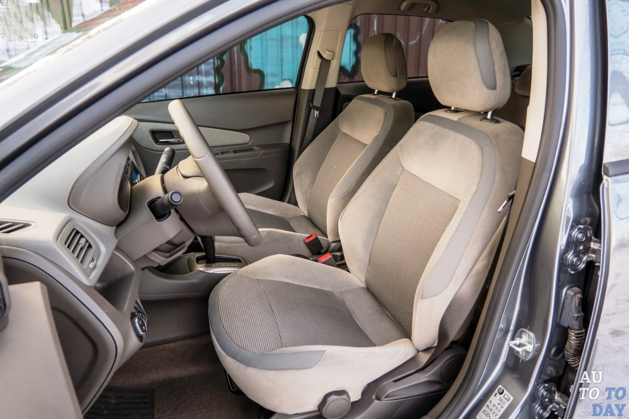 Двери седана открылись очень широко, так что на водительское место можно сесть почти прямо, не сгибаясь. Водительское кресло оснащено продольной регулировкой, настройками по высоте подушки и углу наклона спинки. Кресла простой формы обеспечивают неплохой комфорт. Светлый салон визуально увеличивает пространство. В сочетании с регулируемой по высоте рулевой колонкой это позволяет неплохо устроиться за рулем.