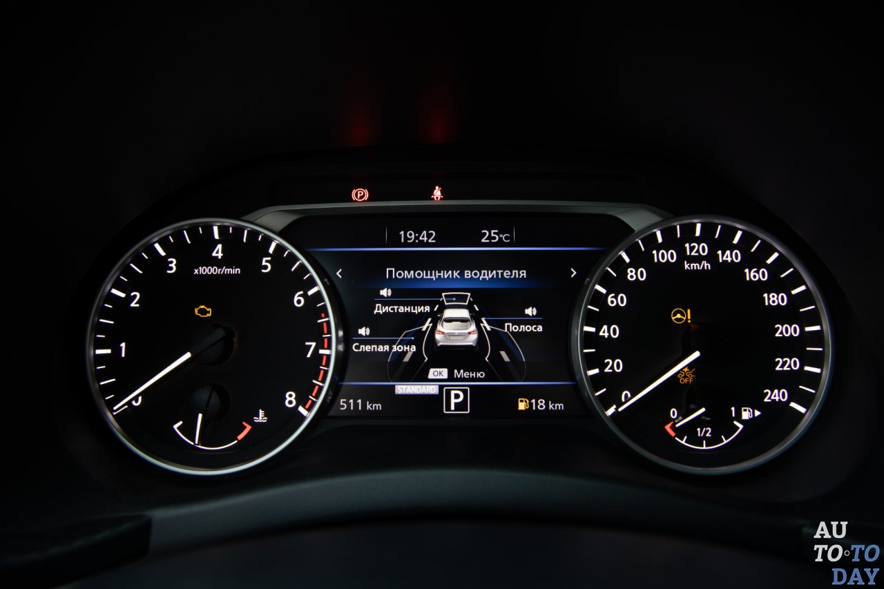 Приятно, что в интерьере также присутствуют элементы от первой генерации: круглое основание кулисы КПП, трехспицевый руль, круглые дефлекторы обдува и пр. К эргономике – никаких вопросов: широкие диапазоны регулировок позволили даже рослому водителю найти «свое» место. В салоне скомбинированы самые разнообразные материалы: глянцевый и матовый пластик, кожа и ее заменитель, полированный алюминий и стекло. Роль управления аудио возложена на парящий 8-дюймовый сенсорный экран новой информационно-развлекательной системы NissanConnect, поддерживающей Apple CarPlay и Android Auto.