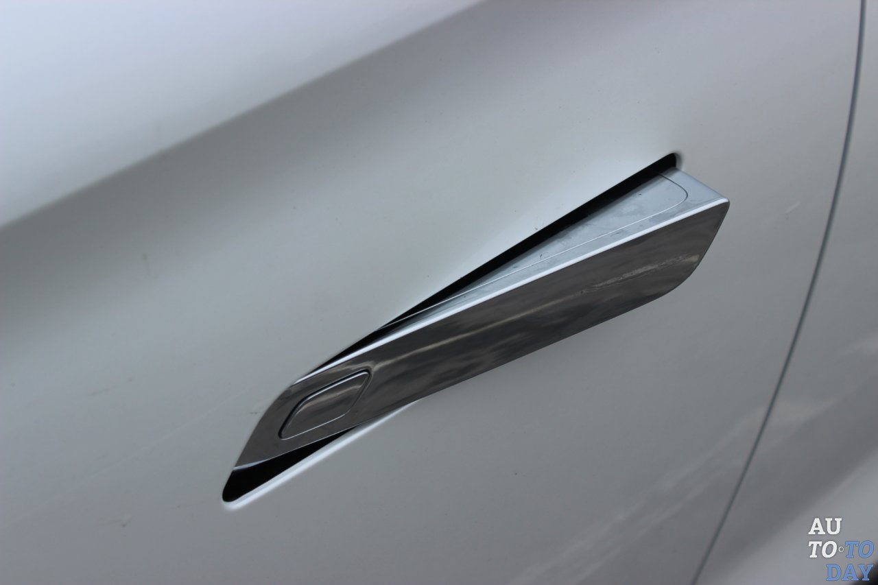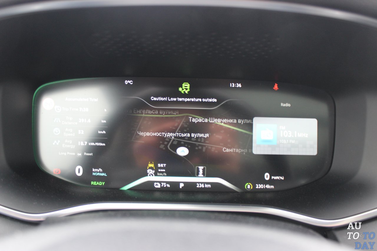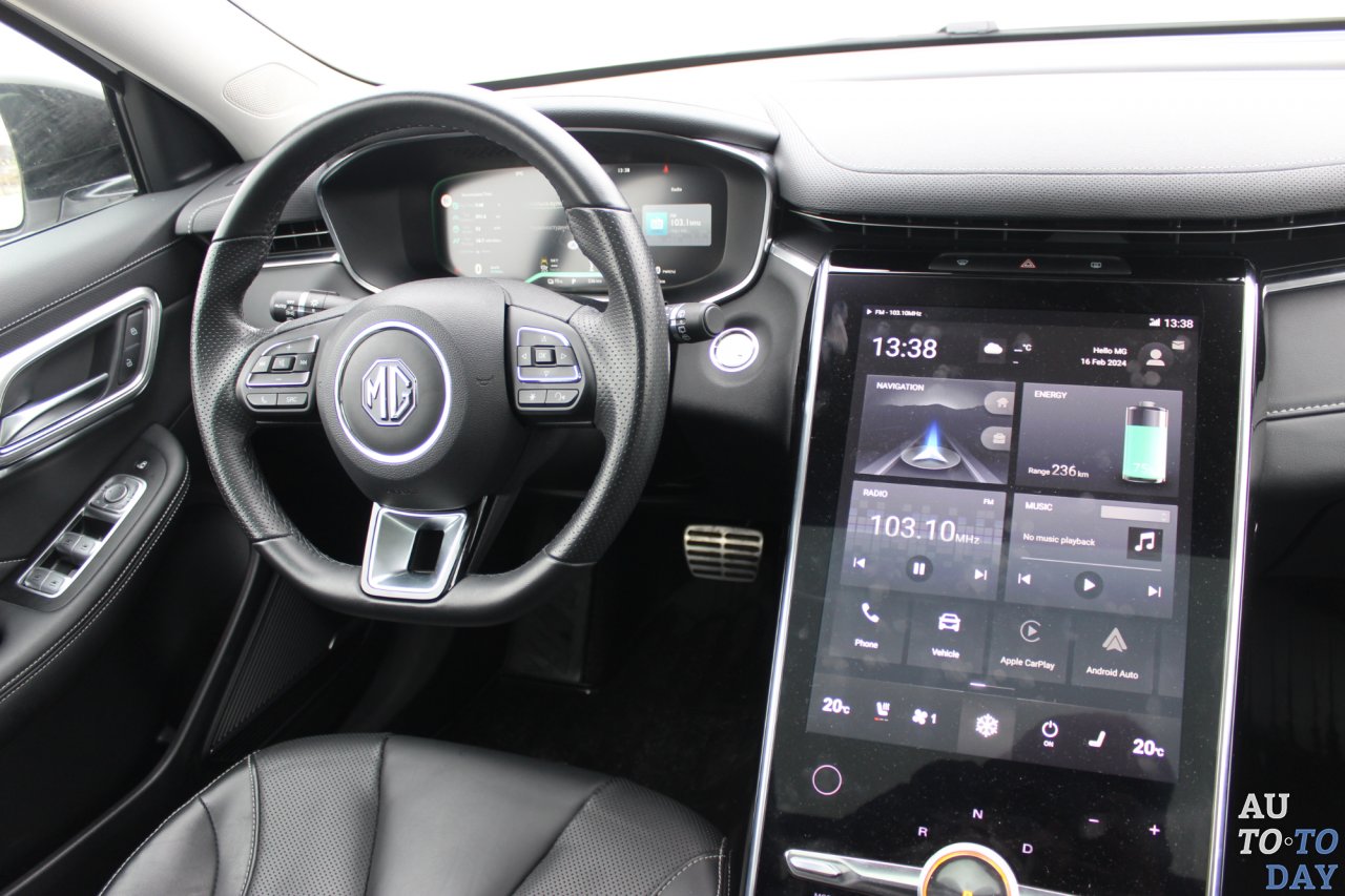 Перший і наступні погляди у салоні приковує до себе похила центральна консоль із вертикальним 19,4-дюймовим дисплеєм. Екран забезпечує гарне зображення, дивитися на нього приємно. Але на ходу можуть виникнути складнощі з роботою: часом страждає чутливість, доводиться натискати повторно або затримувати палець, також під час руху виведена на дисплей карта може здаватись завеликою.