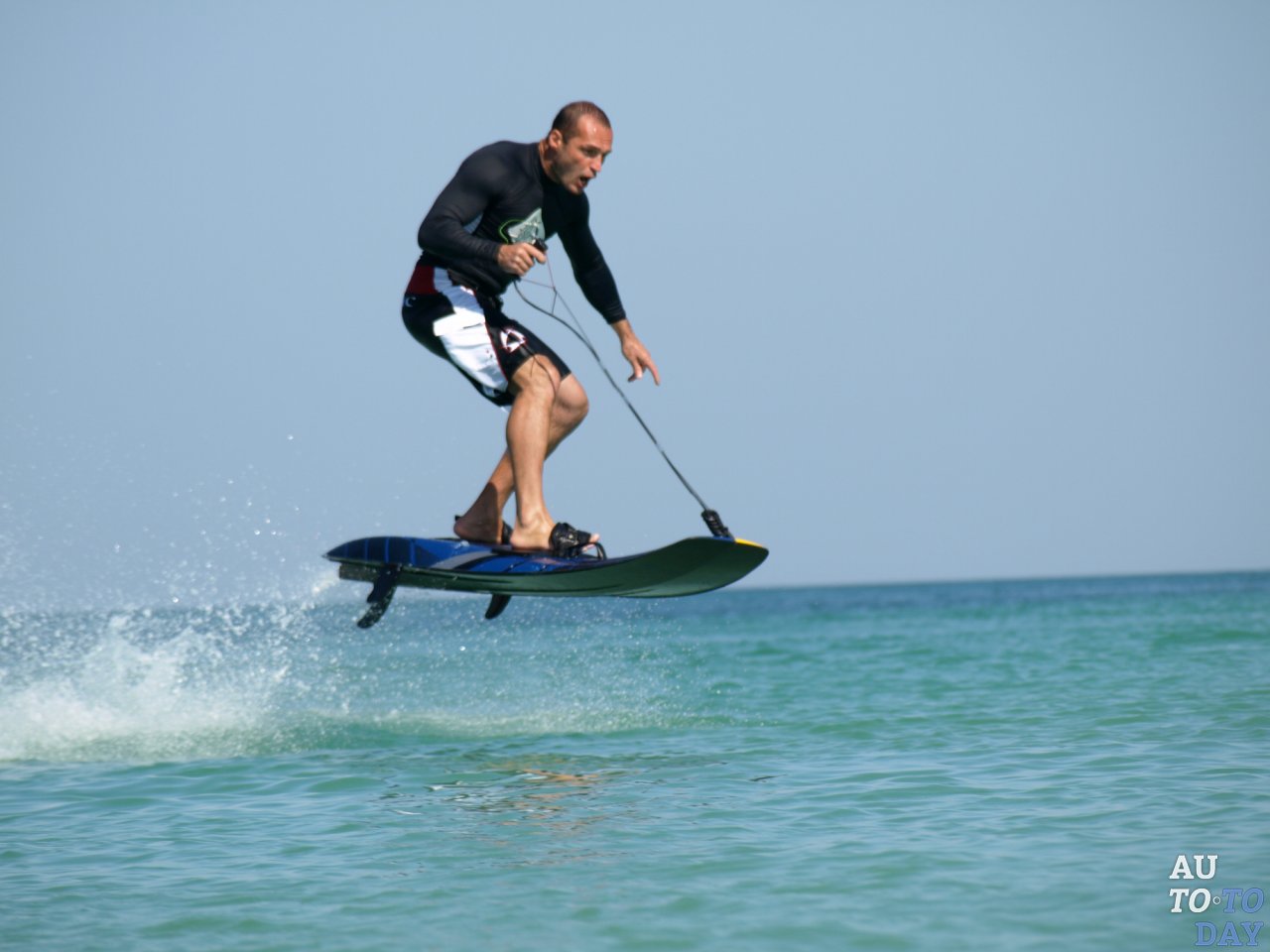 Это необыкновенная доска для серфинга длиною в 1,8 метров.Она приводится в движение бензиновым двигателем на 86 кубов и весит 15 килограм. Эта "крошка" разгоняется до 48 км/ч. Топлива хватает на 3 часа езды.