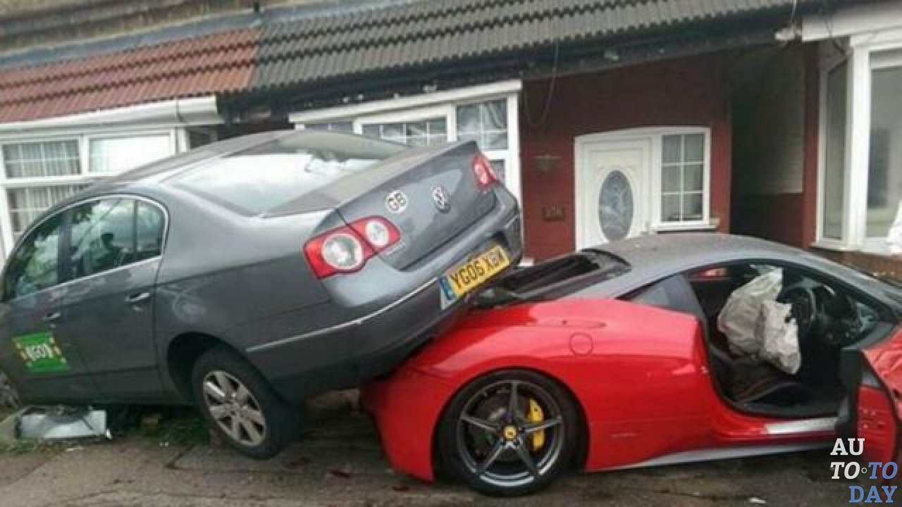 Этот инцидент случился с жителем Британии, который хотел "повыделываться" перед родственниками, арендовав Ferrari стоимостью 220 тысяч фунтов. Но как говорится, не тут то было.По дороге на свадьбу, горе-водитель не справился с управлением и суперкар напоролся на террасу частного дома. в результате машину зажало такси.