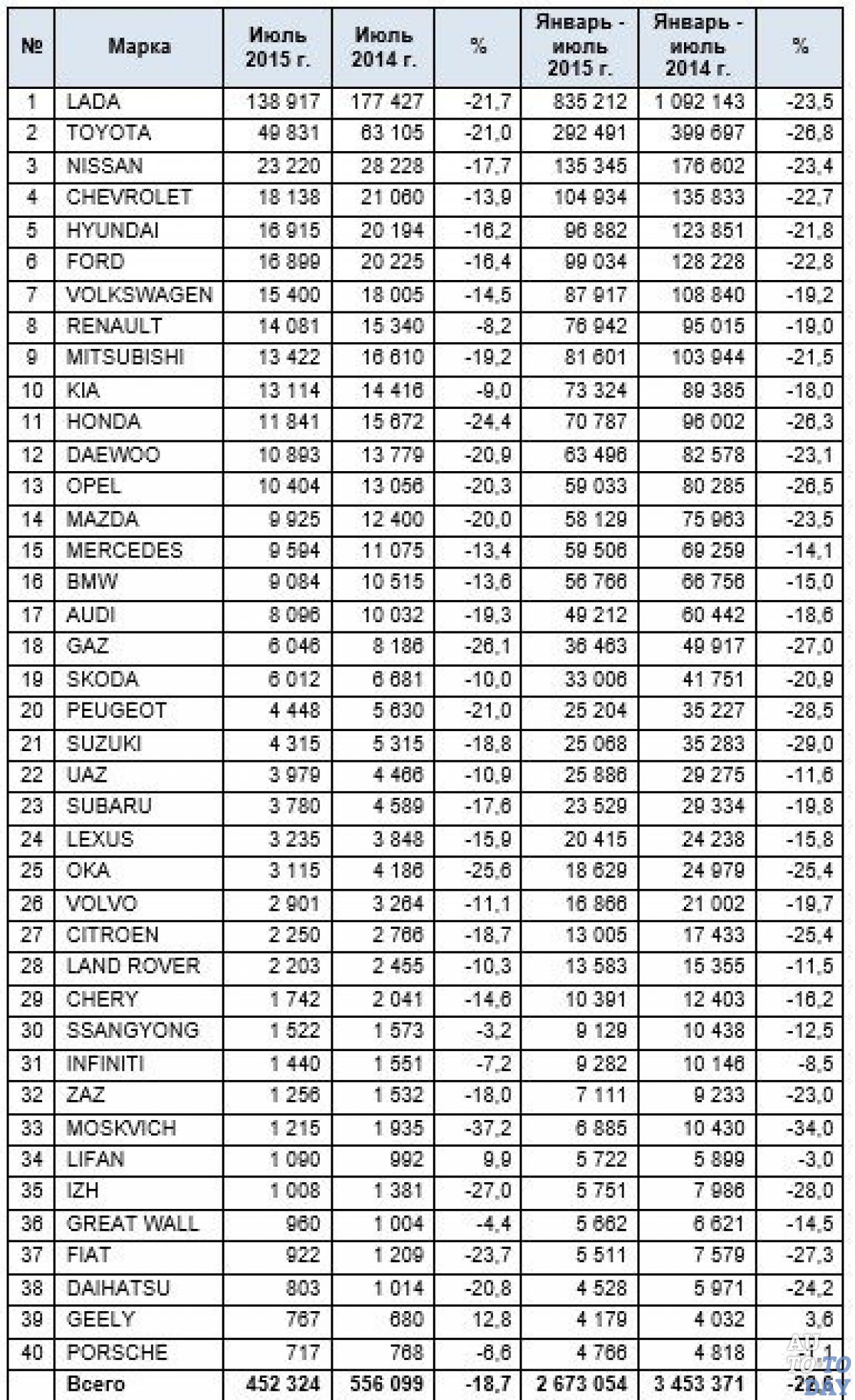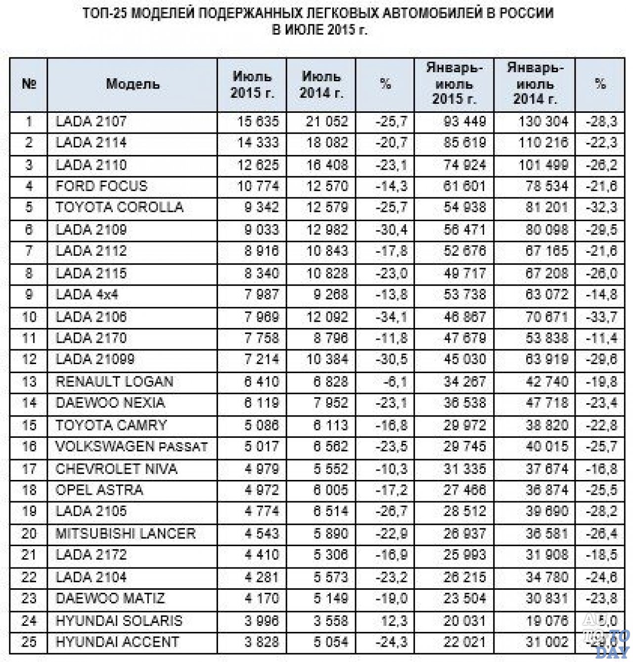 Июльские показатели продаж б\у автомобилей в России снизились на 18,7%. В прошлом месяце продали чуть более 452 тыс. шт., а в первом квартале этого года продажи снизились на 22,6%, до 2,7 млн штук. Лидер продаж: модели Lada (Lada 2107, 2106, Lada Samara, Lada 2110, 2112), которые составили одну третью рынка. Хотя на 25,7% снизились перепродажи Lаda 2107.