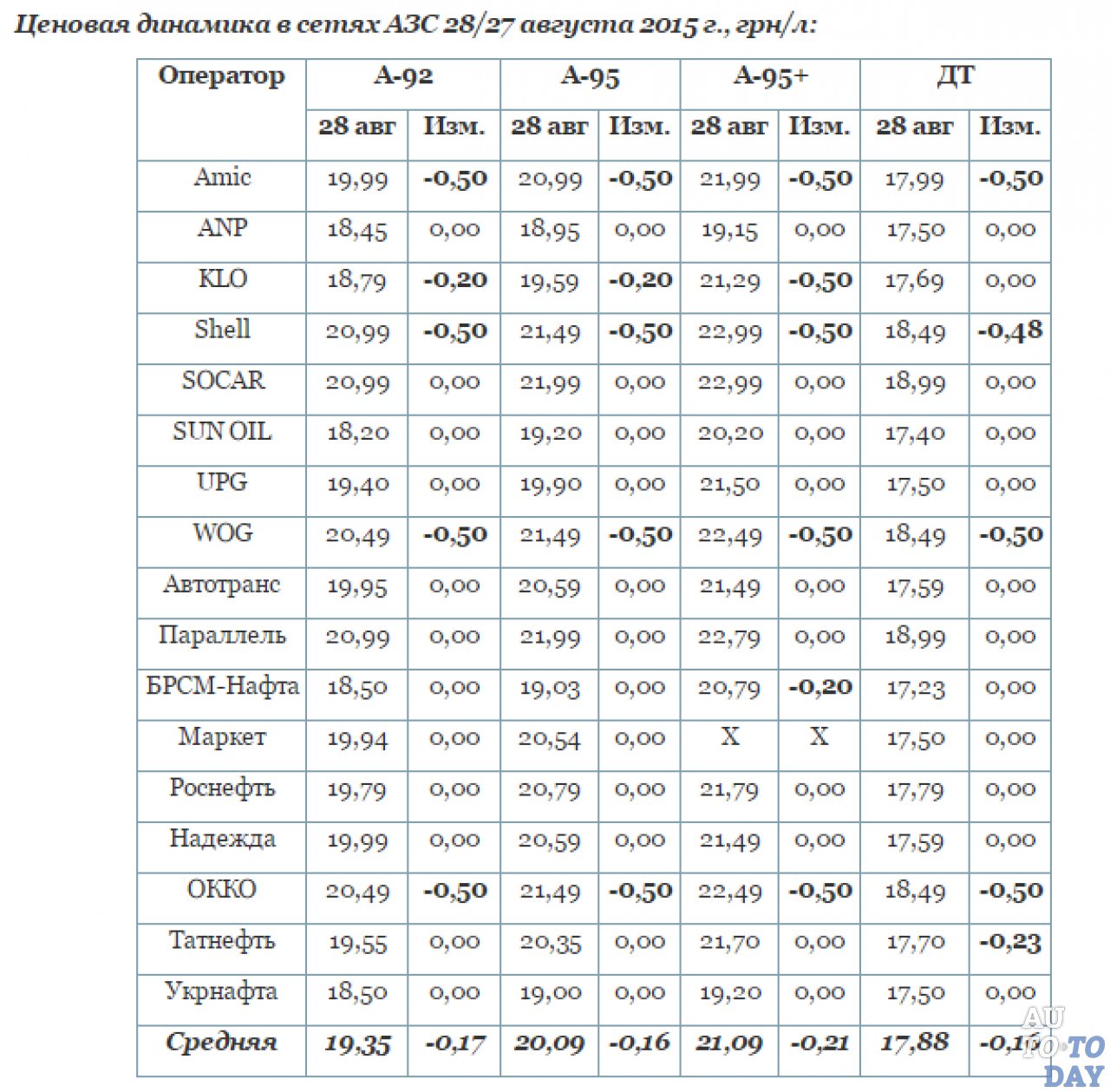 Так, на 28 августа бензин А-92 подешевел на 17 коп/л (до 19,35 грн/л), А-95 – на 30 коп (почти до 20 грн/л), а дизель – почти на гривну (до 17,88 грн/л).