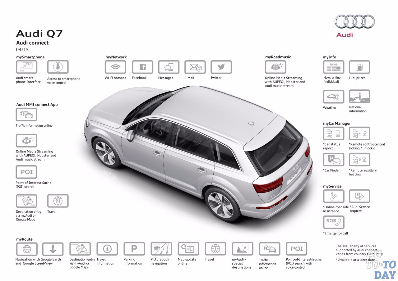 Сделка заключена с ирландской фирмой Cubic Telecom, и будет применяться к автомобилям, которые используют второе поколение модульной информационно-развлекательной платформы компании: A3, A4, A5, Q2 и Q7. Система Audi Connect включает в себя навигацию с помощью Google Earth и Street View, путешествия, данные о пробках, Twitter и электронную почту, а также календарь. Клиенты будут иметь возможность использовать неограниченный объем данных для этих функций за фиксированную плату на срок до трех лет, что позволит резко снизить высокую плату за роуминг в некоторых сетях.