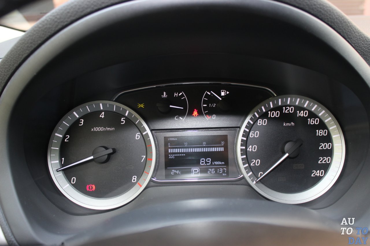 Аналоговый щиток приборов легко читается. Монохромный дисплей бортового компьютера имеет несколько мелковатый шрифт, который не всегда сразу воспринимается при торопливом взгляде на него. Но кроме стандартных расхода топлива, пробега до заправки, средней скорости и пр., он имеет один любопытный режим – индикацию экологичности езды, которая зависит от интенсивности нажатия на педаль газа, плавности торможения и разгона. А на большой экран можно вывести результаты экологичности своего заезда в баллах, при этом – никакого экорежима трансмиссии и мотора. Такая себе честная игра в экономию – расход топлива целиком в ваших руках.