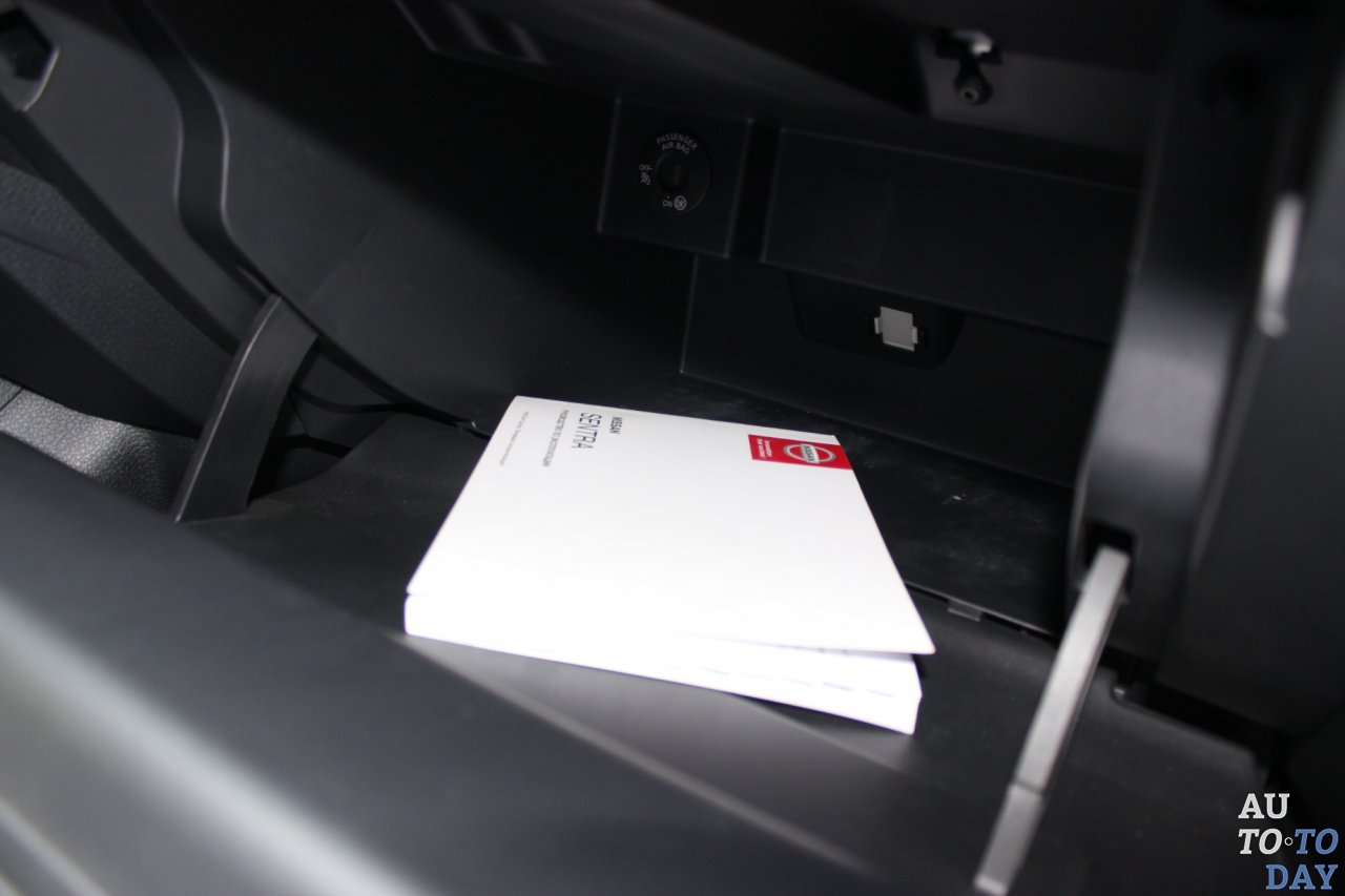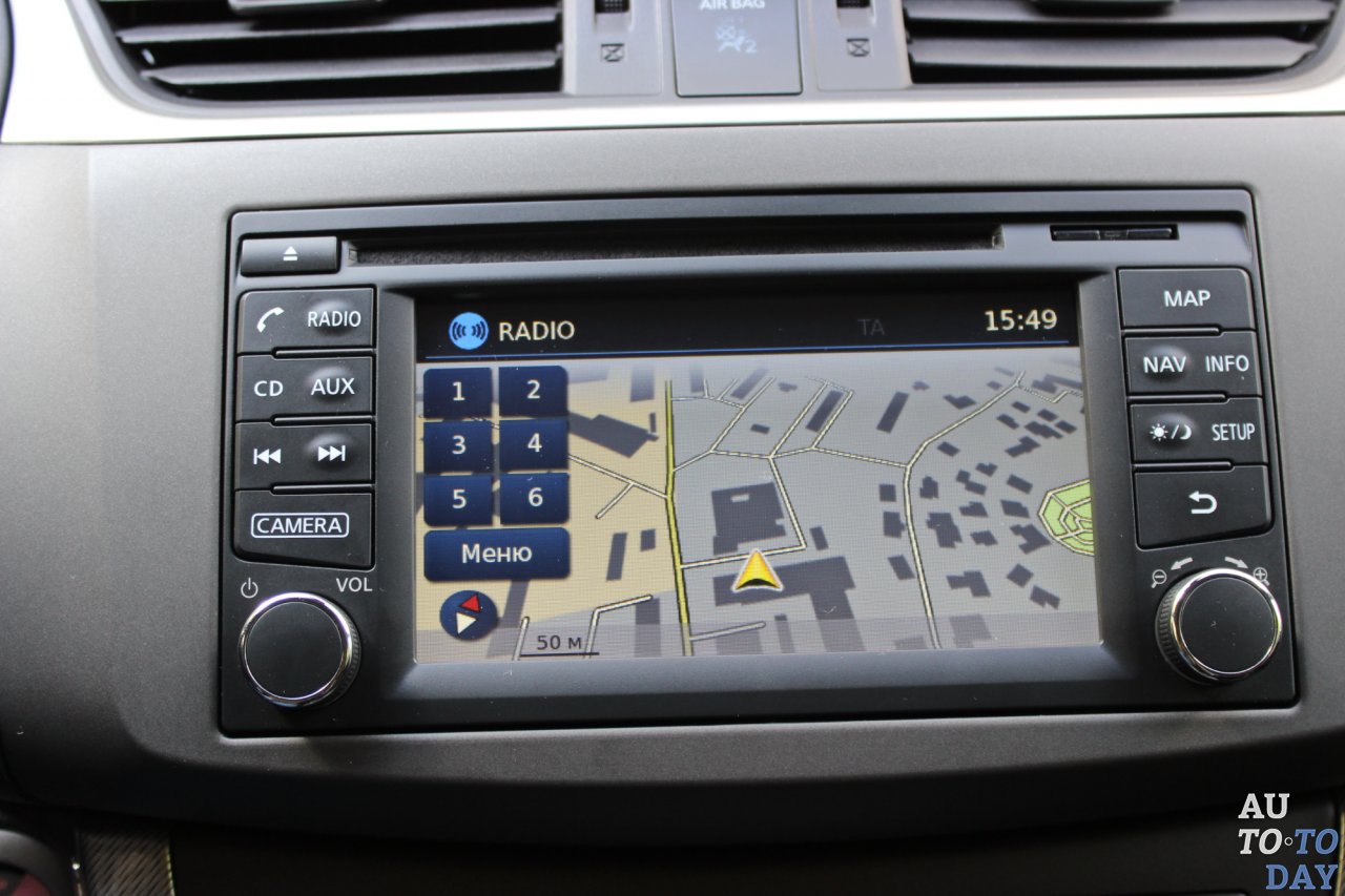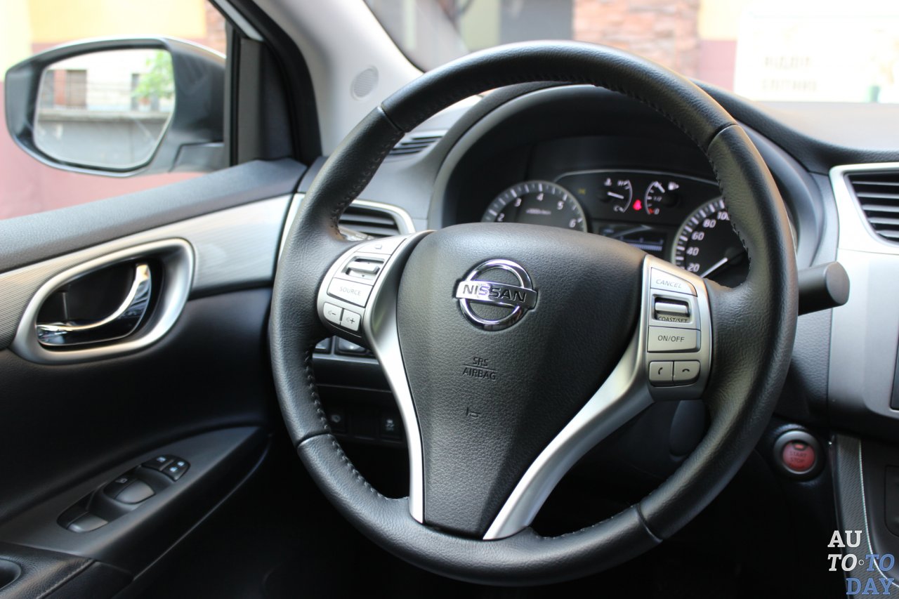 Рулевое колесо, обтянутое кожей, не претендует на оригинальность по форме, но в плане удобства с ним все в порядке. На него вынесено управление круиз-контролем, аудиосистемой, бортовым компьютером, а также подключенным к машине мобильным телефоном. На центральной консоли под дефлекторами обдува расположился цветной дисплей мультимедийной системы с диагональю в 5,8 дюйма. Его размера вполне достаточно, чтобы пользоваться камерой заднего вида, найти необходимый объект на карте и даже читать новости. Чтобы быть в курсе событий, необходимо подключить к машине смартфон и скачать на него приложение NissanConnect. От телефона машина получит интернет-соединение и пустит вас в несколько предустановленных приложений (Google Search, Eurosport и пр.). Ниже экрана установлен блок двухзонного климат-контроля.
