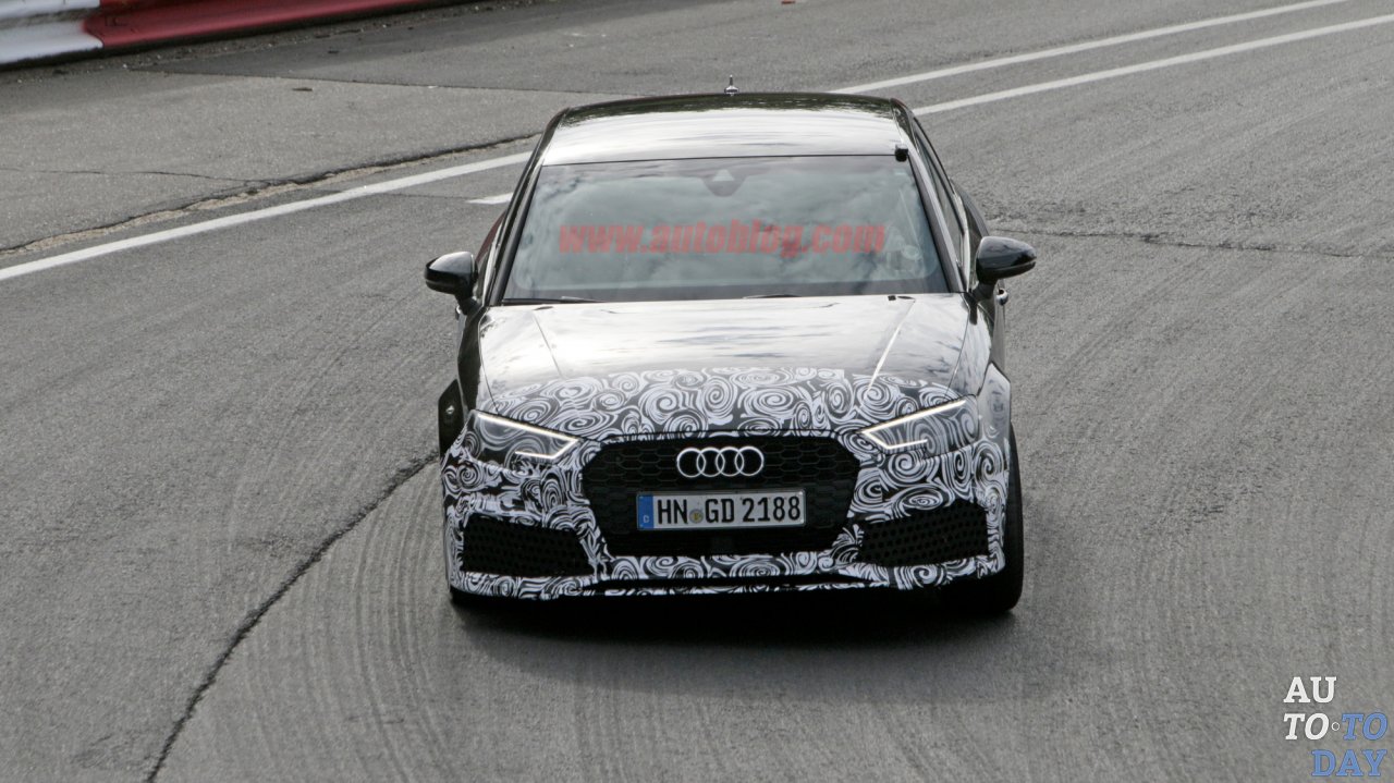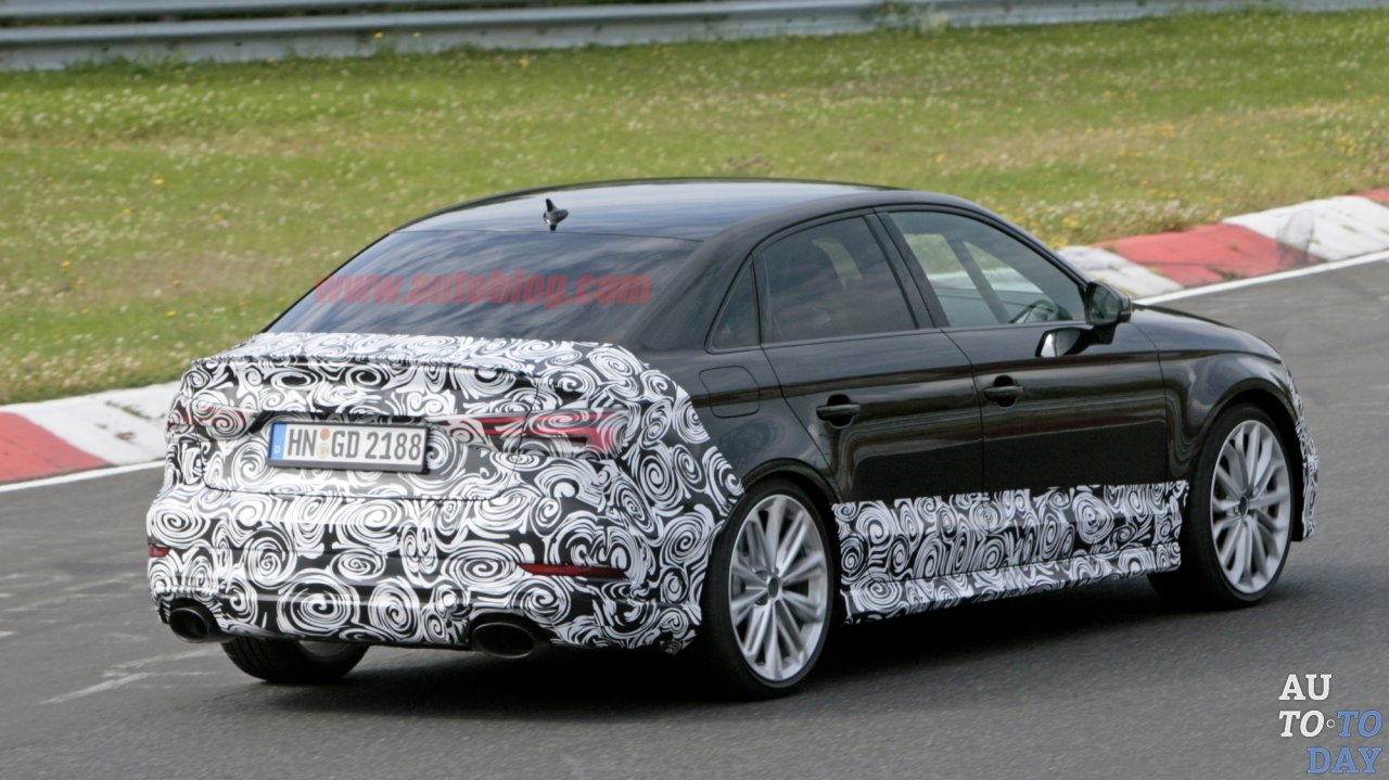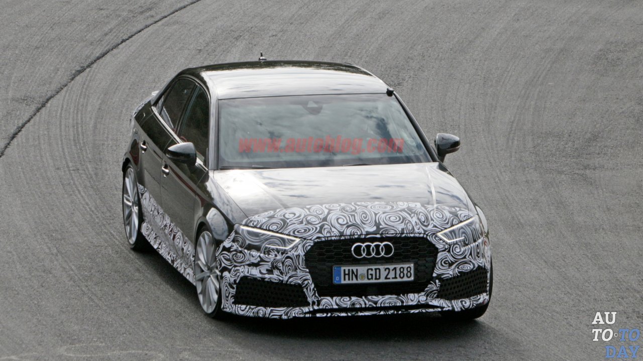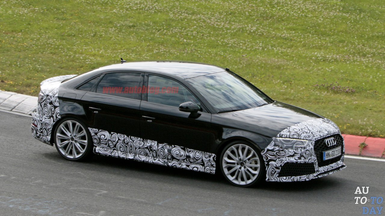 Шпионские фотографии показывают как черный частично покрытый в камуфляж седан RS3 осваивает трассу в Нюрбургринге. Но даже через камуфляж можно увидеть все основные отличительные черты Audi RS: большие колеса, тормоза и защитный щиток. Передок имеет шестиугольную структуру решетки, что типично для моделей RS, в то время как воздухозаборники стали больше, а диффузор кажется разместился ниже, чем в стандартных автомобилях. Со стороны видны тормозные суппорты, а сзади две большие выхлопные трубы заменили стандартные, и это самый большой признак отличия RS3. Такие модели, как S3 и S4 имеют насадки на выхлопные трубы, а модель RS имеет два больших выхода как в RS3 Sportback.