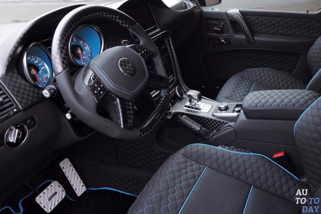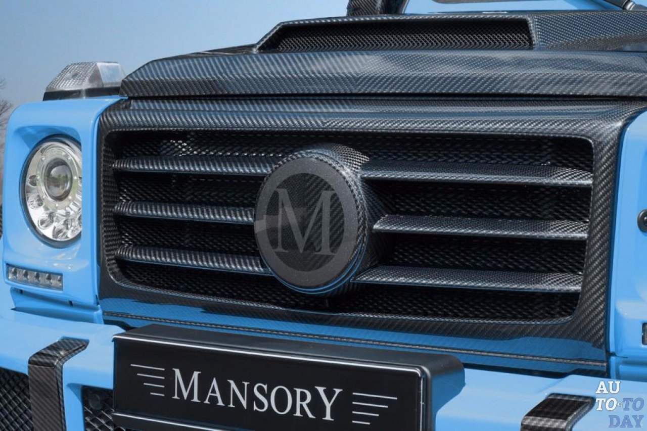 Сильно модифицированный Mercedes G-Class спереди был украшен углеродным волокном на боковых элементах вокруг фар, а дополнительные светодиодные фары прибавили сурового виду. Тема углеродного волокна присутствует и на боках авто с новыми зеркальными корпусами, колесными арками и дверными ручками. Тот же материал используется для крыши и задней отделки, чтобы завершить радикальный внешний вид. Внутри дизайнеры Mansory сделали новую обшивку, изменили оформление приборки и добавили больше карбона. Кажется, только зона регулятора системы Comand и рычага переключения передач осталась неизменной.