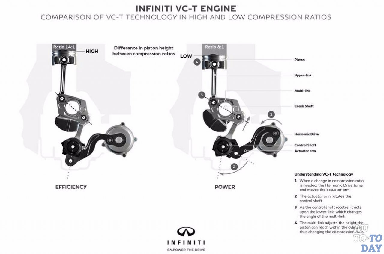 Двигатель VC-T производит около 270 лошадиных сил и 288 Нм крутящего момента. Что еще более важно, он почти на 27 процентов более экономичен, чем обычный бензиновый двигатель и, следовательно, также эффективен как 2,0-литровый дизельный. В основе технологии двигателя лежит его способность поднимать и опускать высоту подъема каждого поршня. Это означает, что двигатель может существенно скорректировать его отношение перемещения и сжатия на ходу (8: 1 для вождения высокой производительности и 14: 1 для достижения максимальной эффективности). Двигатель также обещает быть столь же плавным, как большой V6, и на самом деле боле легким и компактным, чем сопоставимые моторы с четырьмя цилиндрами.