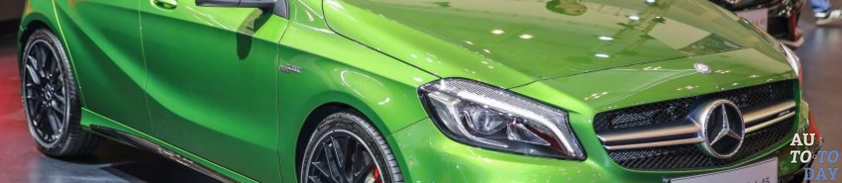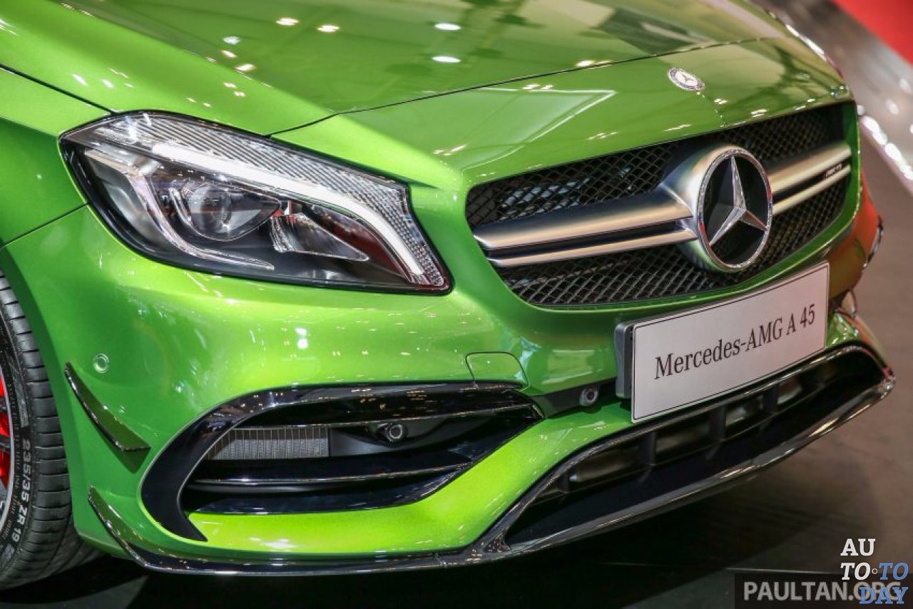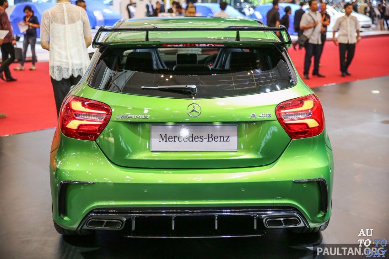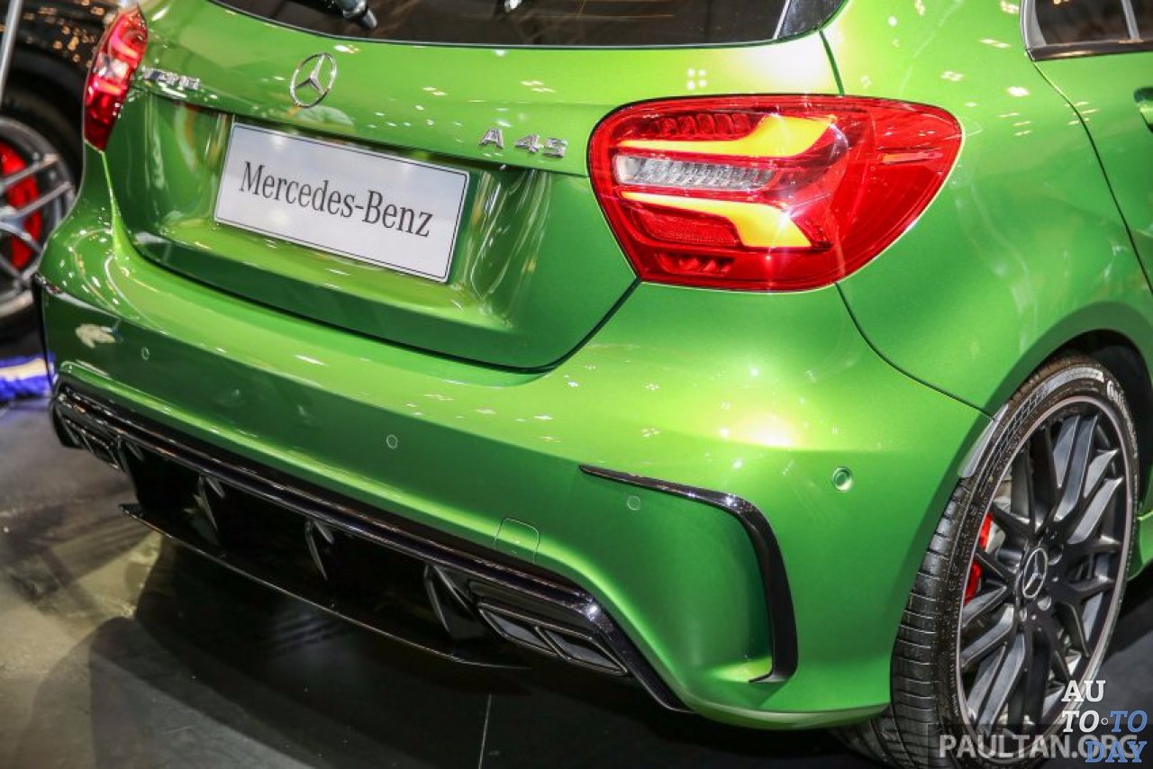 Горячий хэтчбек обычно был заказывают в более традиционных цветах - черном, белом, красном - но эта модель выделяется необычным цветом зеленого минерала эльбаита. Выставочная модель Mercedes AMG A45 на автошоу GIIAS отмечается визуальными опциями - аэродинамическим пакетом AMG с передним пультом индикаторов неисправностей, огромным задним крылом и плавниками над фальшвентиляционными отверстиями на заднем бампере; ночным пакетом с черным глянцем на боковых зеркалах, переднем сплиттере, боковых юбках, отделке окон и на выхлопной трубе.