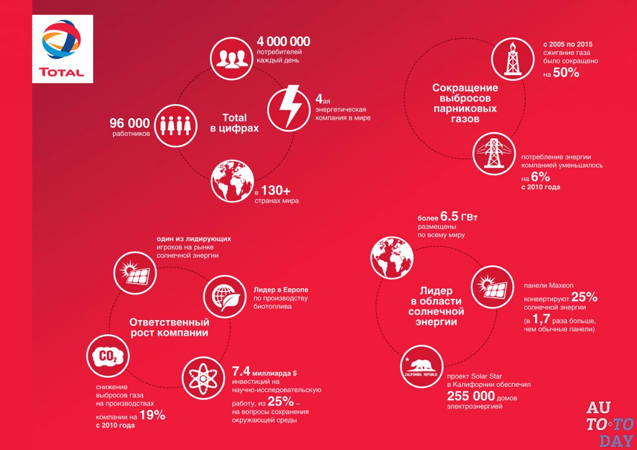 Сокращение энергопотребления и интеграция возобновляемых источников энергии в разные сферы деятельности – мировой тренд. Законы в сфере защиты окружающей среды становятся все жестче, а экономический фактор заставляет компании постоянно сокращать издержки. Total занимает 4-е место среди энергетической компании в мире, она системно работает над созданием эффективных решений в сфере энергосбережения.