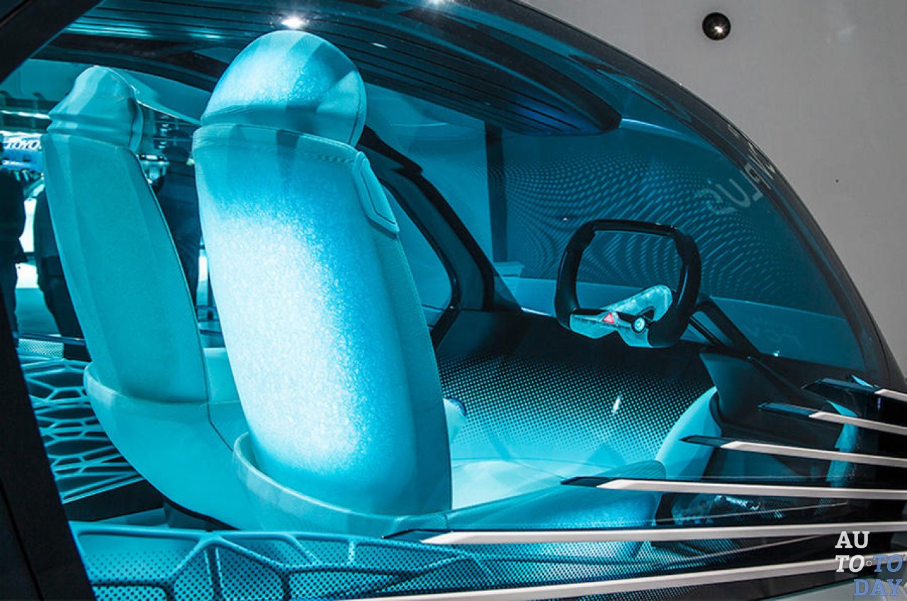 Внутри, это четырехместный автомобиль в футуристическом дизайне, отсутствует какая-либо приборная панель, есть просто минималистский руль.