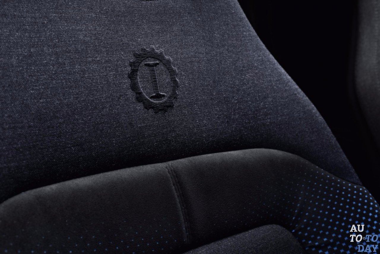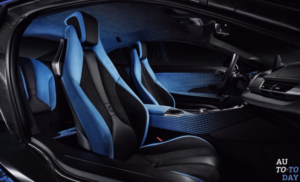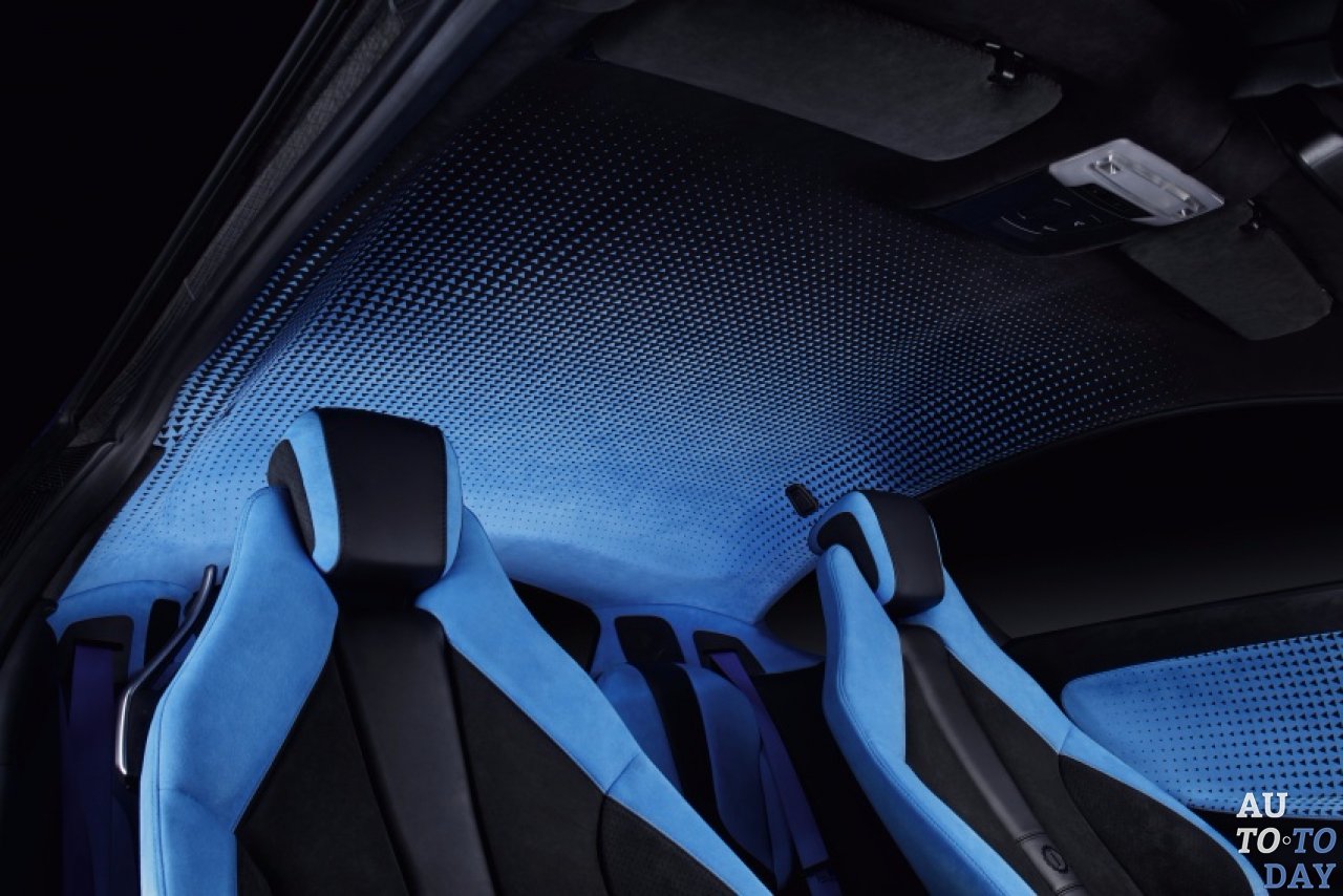 Интерьер i8 Garage Italia CrossFade следует внешнему дизайну. Для обивки используется элитный цветной текстиль и отделочный материал Alcantara в том же темном серебристо-синем переходе цвета.