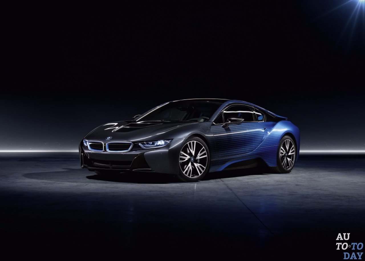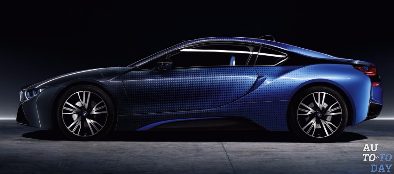 Передняя часть гибридного спортивного автомобиля i8 окрашена в цвет Protonic Dark Silver, который плавно переходит в Protonic Blue в задней части. Это все делается с использованием новейшей техники компании CrossFade. Процесс заключается в том, что для того, чтобы создать желаемый геометрический рисунок и переходящие цвета, используется трафарет.