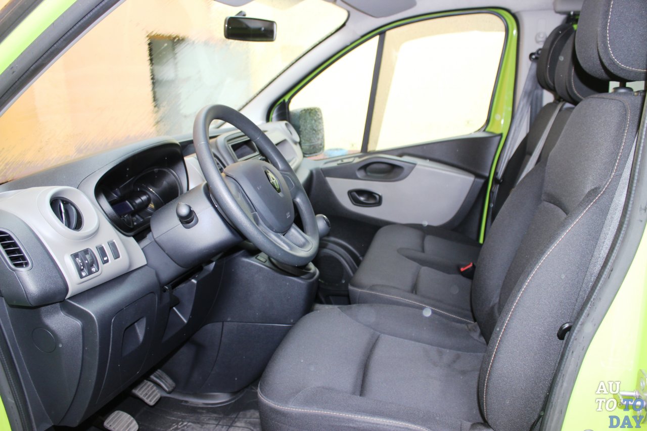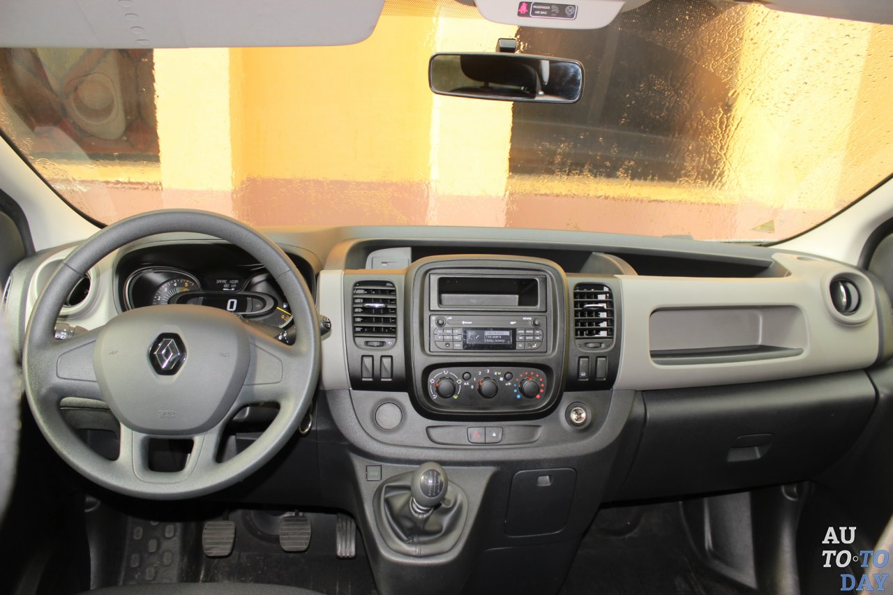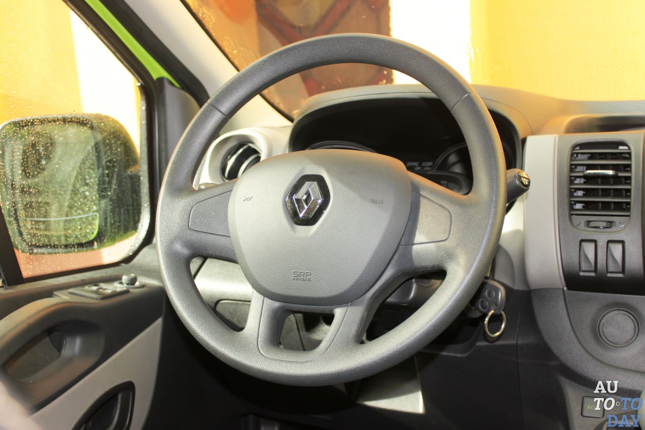 Рулевое колесо по форме напоминает другие модели компании; толщина его обода, к слову, могла бы быть и потолще. Щиток приборов с электронным спидометром, уже знакомый по компактному кроссоверу Renault Captur, смотрится на «Трафике» органично. Почти все кнопки сконцентрированы на центральной консоли (что оказалось очень удобно), остальное же пространство торпедо отдано под различные отсеки. Слева от руля есть закрывающийся кармашек, сверху два вместительных отделения для документов и мелочи, где есть даже USB-порт (можно подключить плеер или навигацию!), справа от рычага КПП выдвижной подстаканник, дальше – огромный бардачок у ног пассажира и небольшой отдел, где за доплату могут расположить фронтальная подушка безопасности сидящего справа.