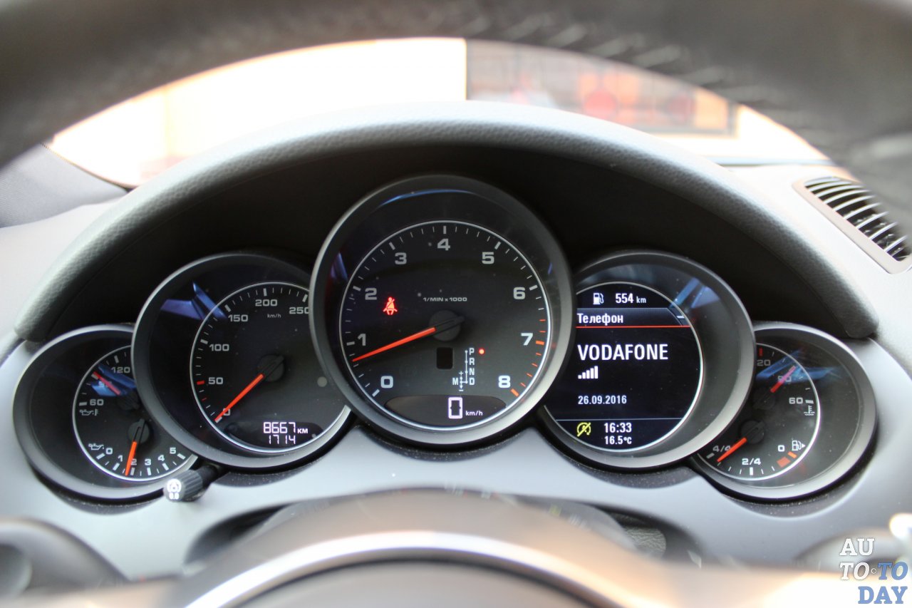 Щиток приборов традиционен для компании из Штутгарта – пять глубоких колодцев, в одном из которых укрылся круглый цветной экран бортового компьютера, на который можно выводить и навигацию. Значения аналогового спидометра мелковаты, но его показания крупно дублируются под тахометром в виде электронных цифр. Рулевое колесо в стиле роскошного Porsche 918 Spyder снабжено удобными кнопками управления музыкой и подключенным телефоном, для круиз-контроля выведен отдельный подрулевой джойстик.
