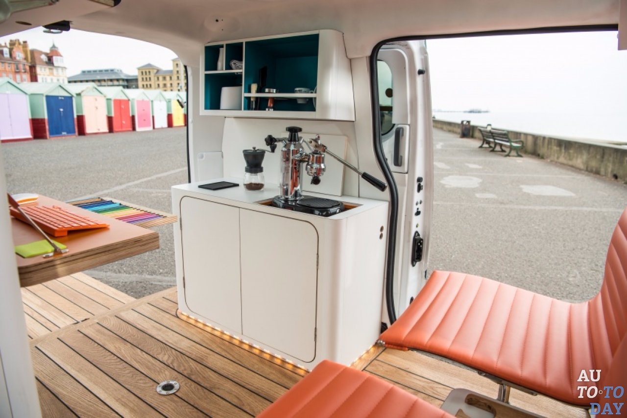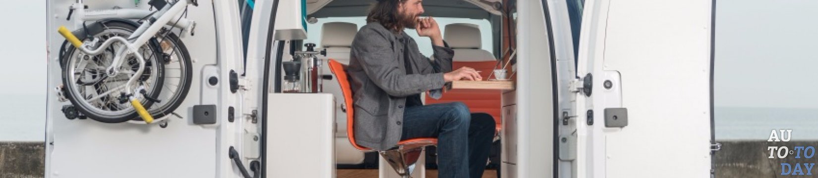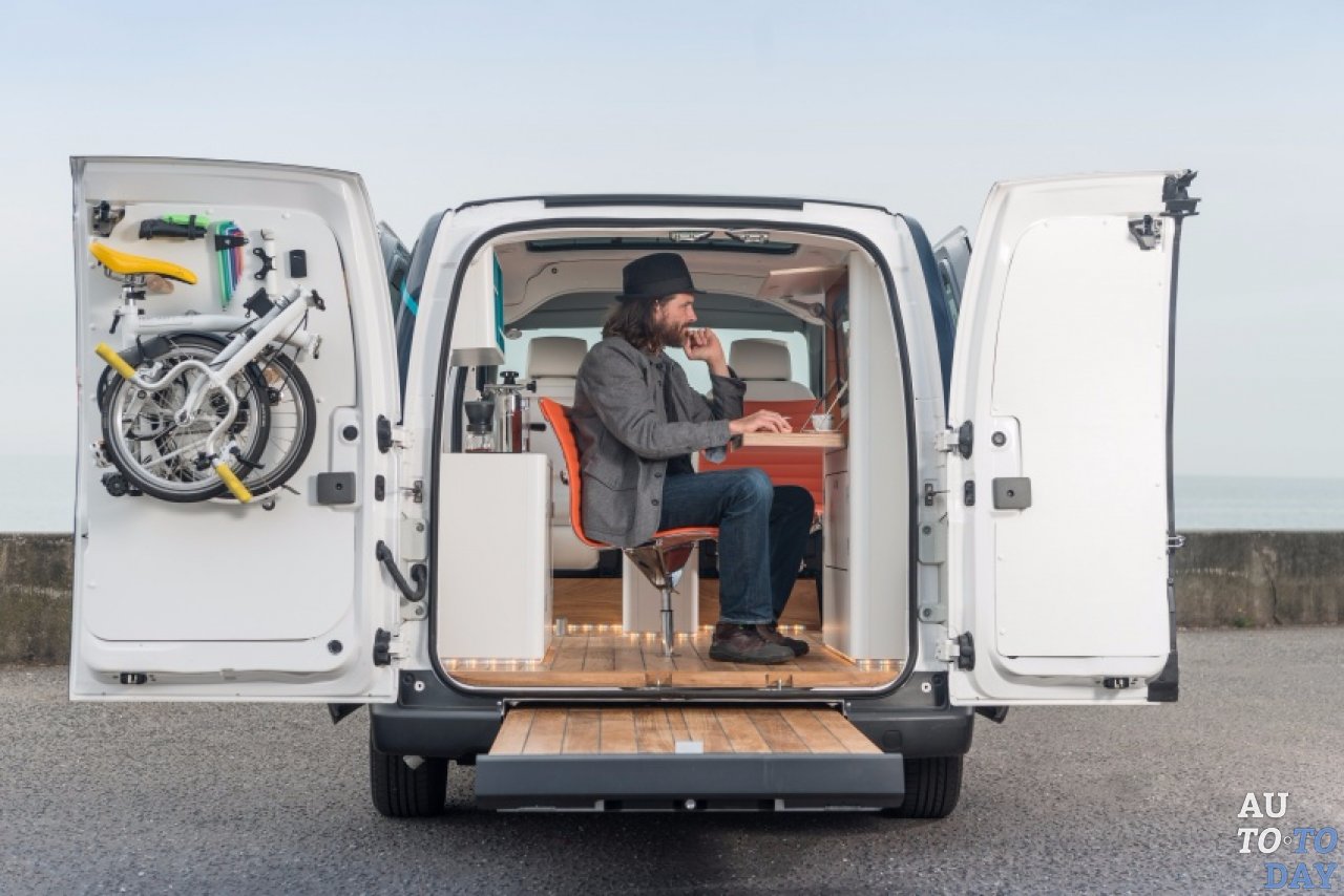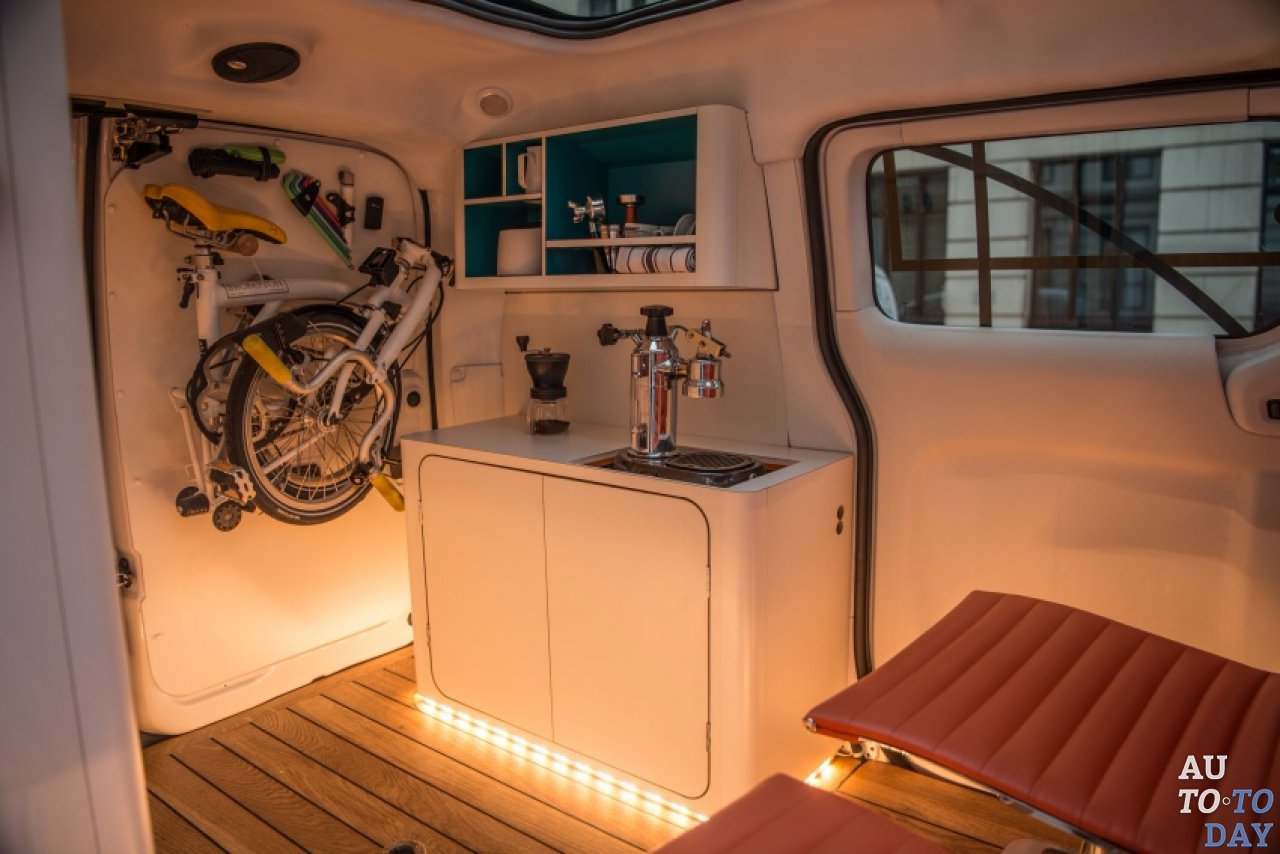 Если погода позволяет, обе боковые раздвижные двери и расщепленные задние двери могут быть открыты для повышения ощущения пространства. Плавающая крыша выдвигается из заднего бампера, обеспечивая открытую площадку, удобную для работы с ноутбуком или просто наслаждения видом. Workspace можно зарядить до 80% в течение получаса, а также в автомобиле есть крепления для складного велосипеда.
