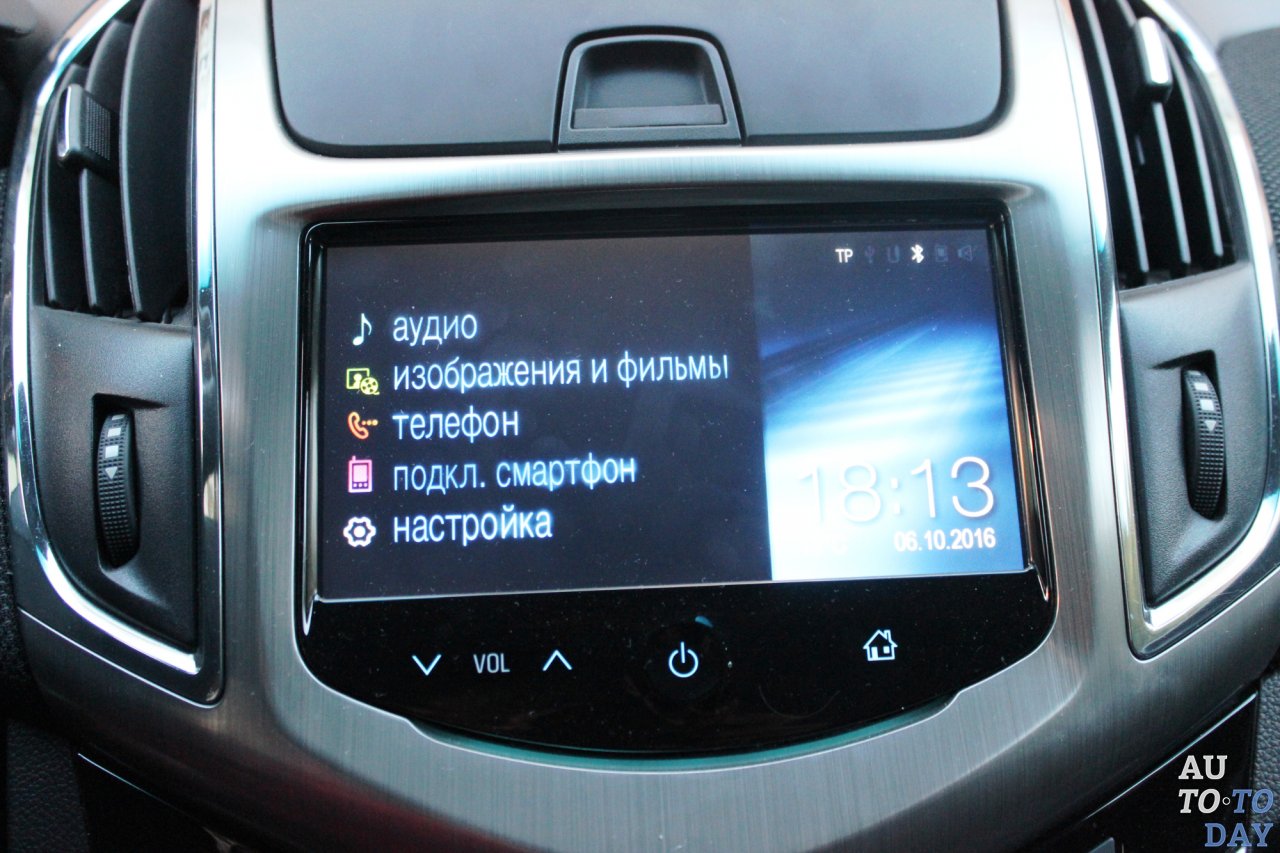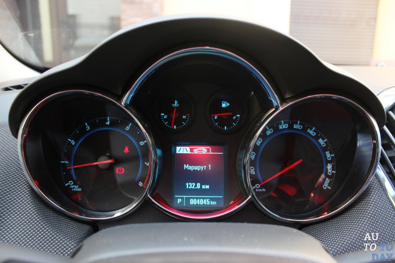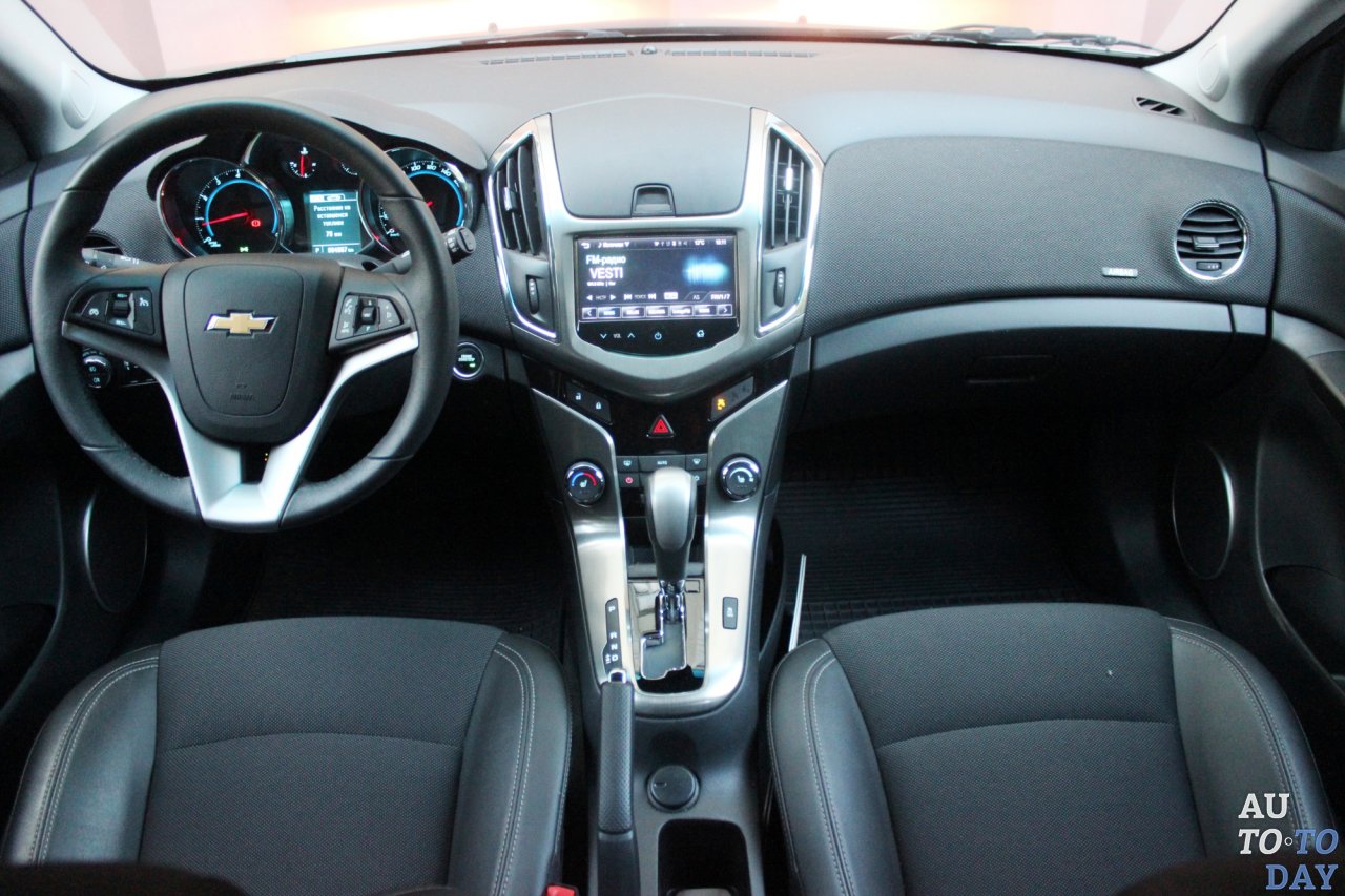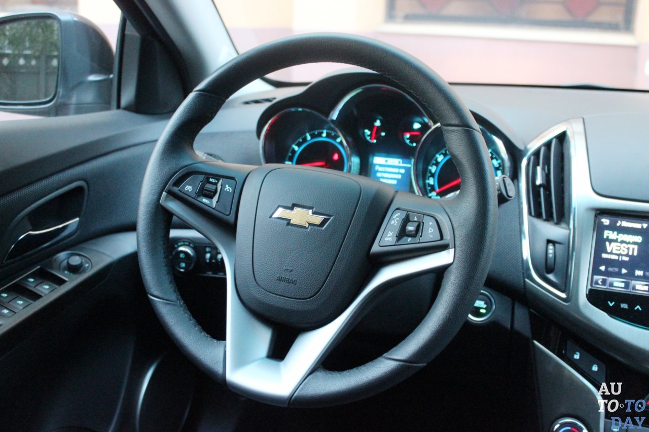 Выше монитора появился удобный закрывающийся отсек для смартфона, в котором разместились разъемы AUX и USB для считывания медиафайлов (аудио, фото и видео) и подзарядки от бортовой сети автомобиля. В остальном все осталось неизменным – зона климат-контроля, управление фарами и пр. Между «горшками» аналоговых приборов расположился двухцветный экранчик бортового компьютера. Интересно, что для управления ним выделили отдельный подрулевой переключатель – хотя обычно конструкторы отделываются парой кнопок на рулевом колесе. Которое, кстати, у Chevrolet Cruze непривычной формы. В средней и нижней части руль нормально толстый, а сверху, где обычно его держит водитель, «бублик» становится тоньше.