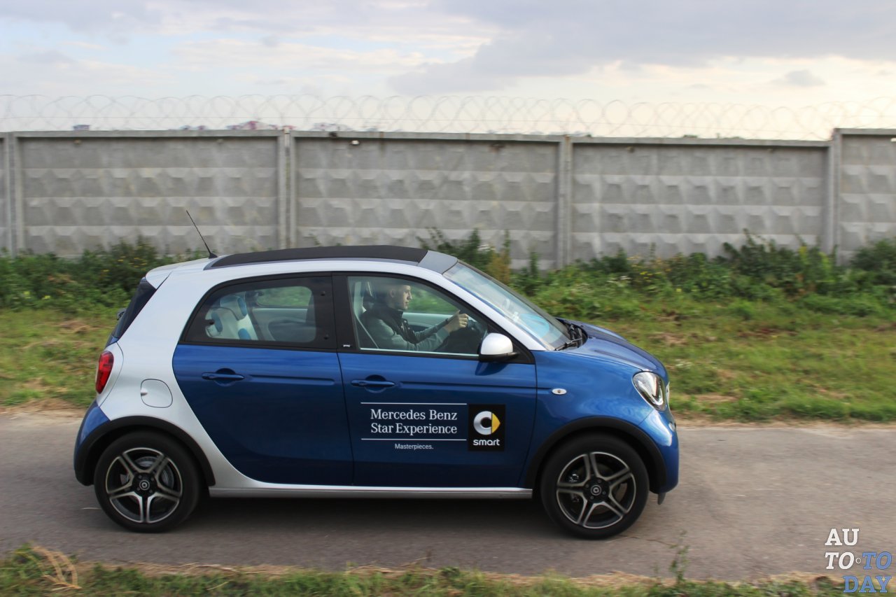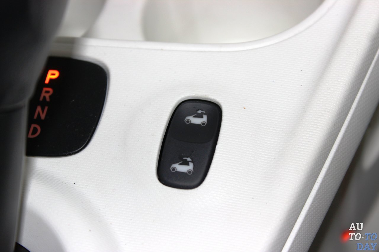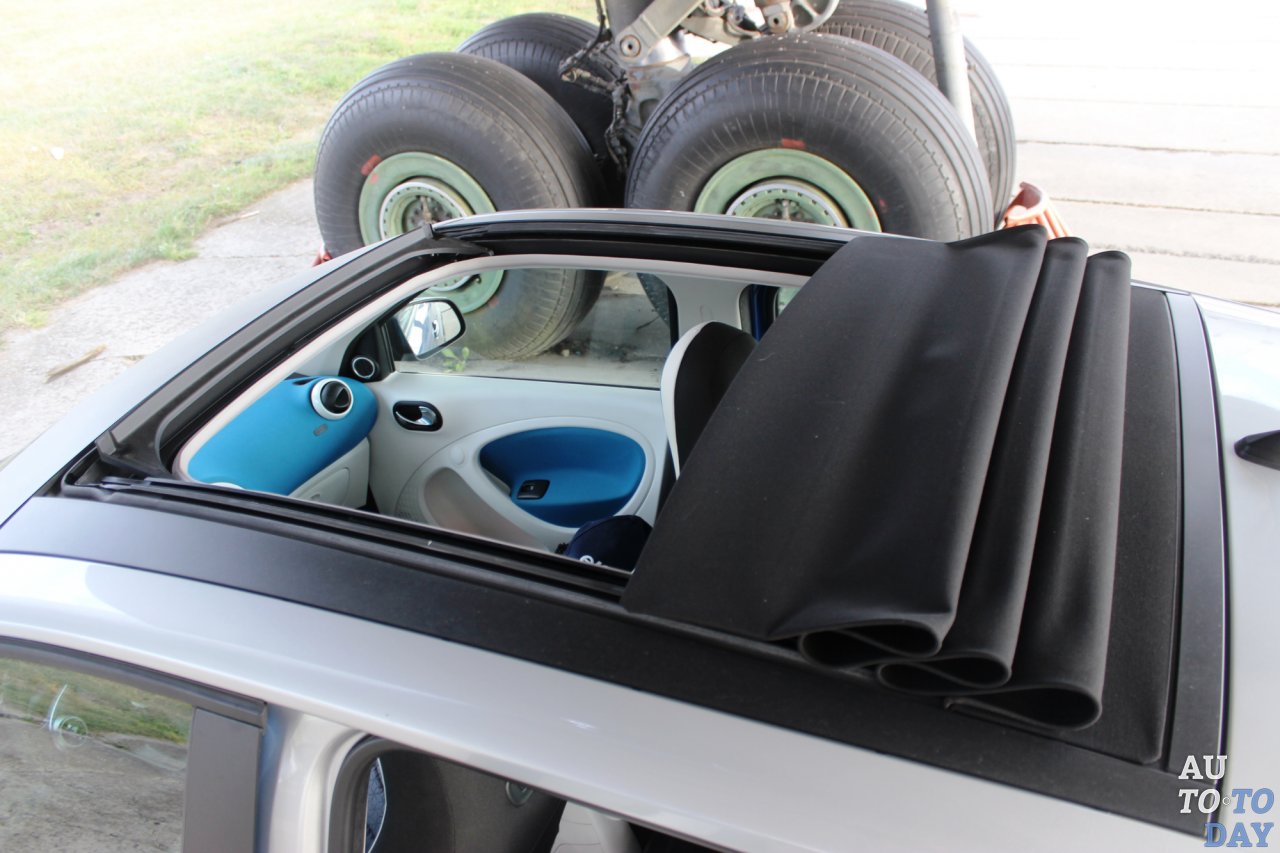 По умолчанию в комплектации proxy «Смарт» оснащается панорамной стеклянной крышей площадью 1,2 квадратных метра со сдвижной шторкой. Но у нашего автомобильчика – особая опция, он имеет настоящий сдвижной тканевый верх! Крыша убирается с помощью электропривода, и делать это можно на любой скорости (наш замер – до 100 км/ч все работает отлично). Сквозь этот огромный люк дождь и холодный ветер на скорости почти не залетают в салон, так что при желании даже в непогоду можно прокатиться с ветерком. Но учтите – через отсутствующий фрагмент крыши в голову будет сильно припекать даже осеннее солнышко, да и к акустическому комфорту появятся большие вопросы.