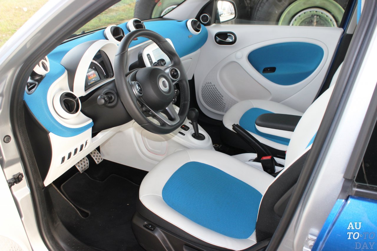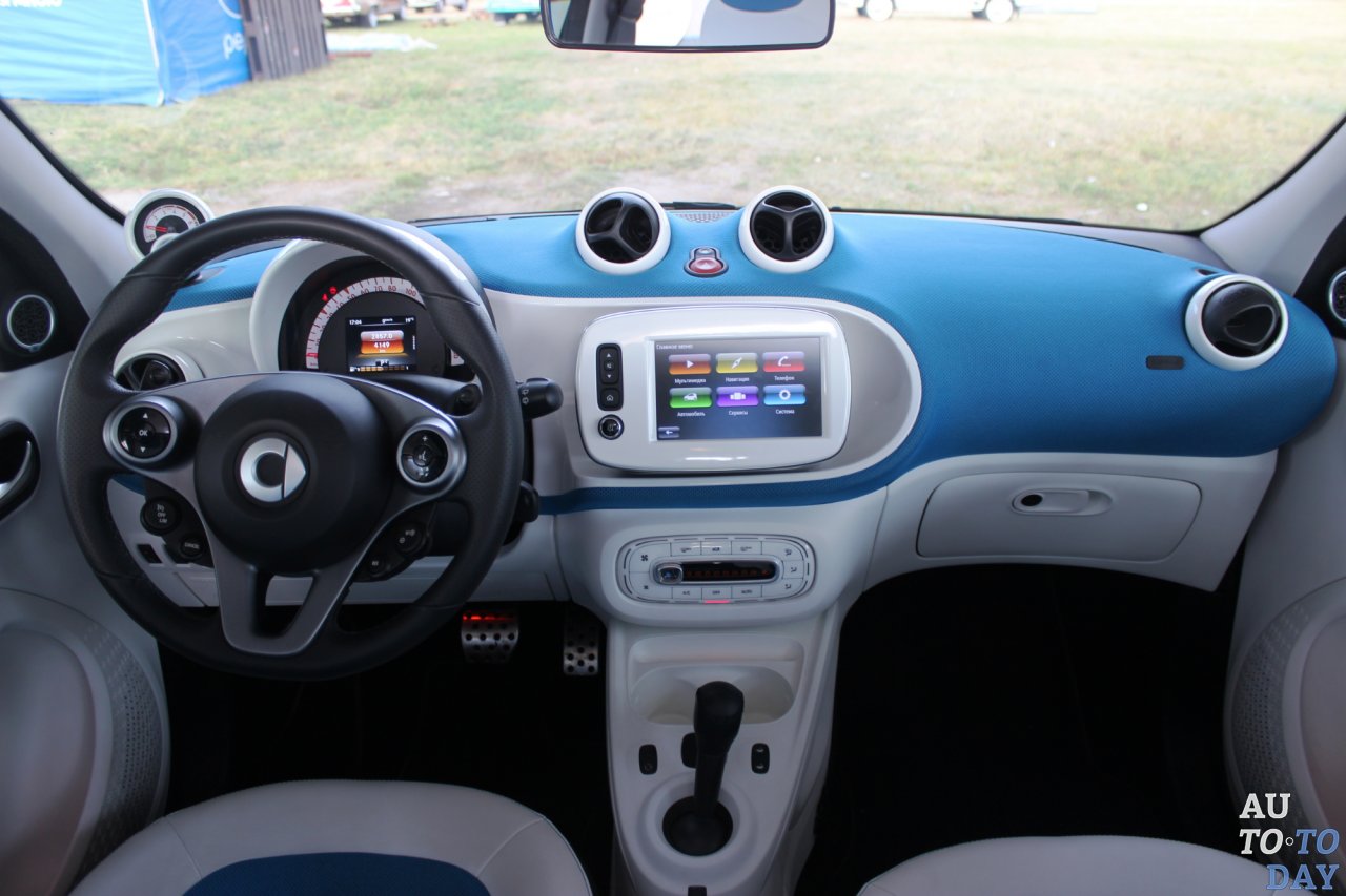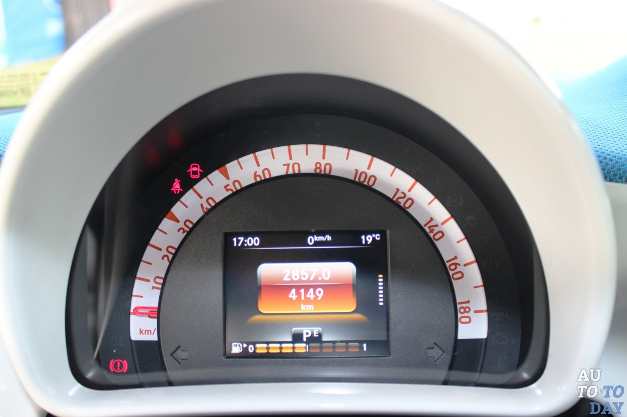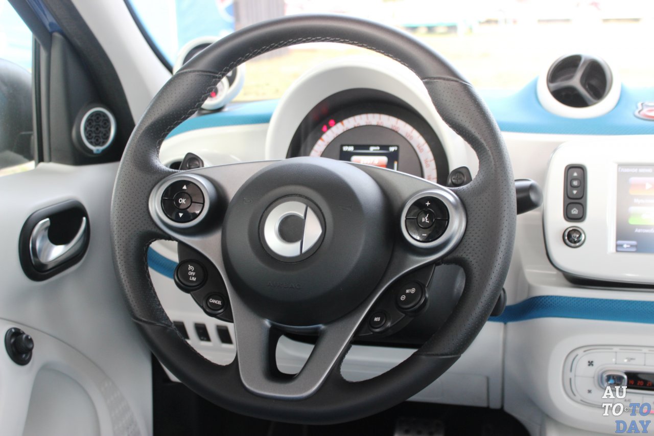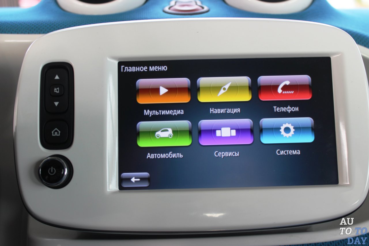 Торпедо «Смартика» от родственника (который без задней пары сидений) отличается лишь материалами отделки, да кнопкой управления сдвижной крыши. Кстати, автоматический режим ее складывания отсутствует, нужно постоянно держать кнопку, чтобы закрыть/открыть тканевый «скальп». Щиток приборов с единственной аналоговой полукруглой шкалой спидометра уместил в себе 3,5-дюймовый цветной TFT-дисплей, с которого можно читать данные борткомпьютера и следить за «экологичностью» вашего стиля вождения. Мультимедийную систему хотелось бы похвалить за адекватное голосовое управление, позволяющие без рук набирать необходимые номера по подключенному через Bluetooth мобильному. Индивидуализировать работу развлекательной системы можно на любой вкус: от выбора значка машинки-указателя на карте навигации и до изменения звука индикатора превышения скорости.