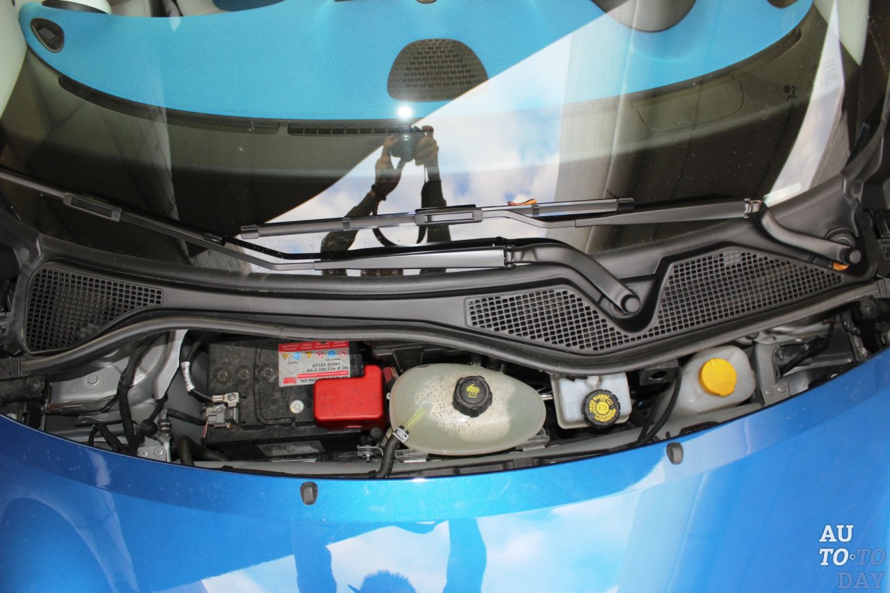 Благодаря большому вывороту колес и очень маленьким свесам маневрирование в ограниченных пространствах и парковка станут для вас просто развлечением. К тому же, успеху маневрирования в стесненных условиях поможет встроенная в эмблему на крышке багажника камера заднего вида (напомню, багажник сзади – как и двигатель!). Двухцветная гамма окраски предлагается для всех комплектаций, но только опционально она может сочетаться в тон с материалами интерьера. В виду того, что двигатель у нашего героя расположен сзади, под полом багажника, то под передний капот вынесены только бачки с техническими жидкостями для долива/контроля да аккумуляторная батарея. Учитывая тот факт, что под передний капот вы заглядывать будете нечасто, в целях экономии веса пластиковую крышку повесили не на классические завесы, а на пару плотных тканевых ремешков.