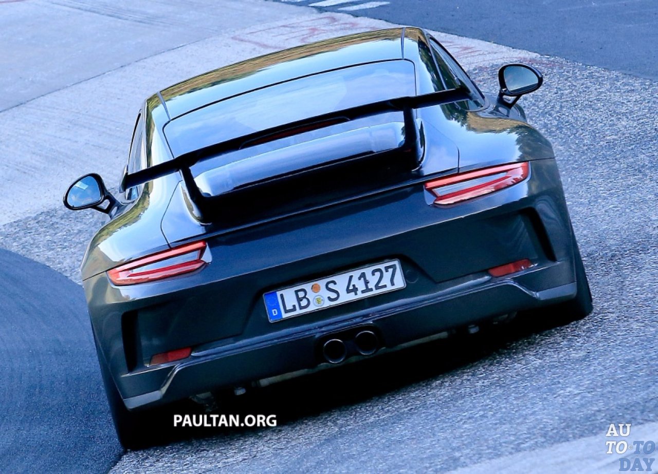 Задняя часть также получила модифицированную, трехмерную заднюю фару, и при этом предстоящий GT3 сохранил центрально установленную выхлопную трубу, которая была установлена еще до обновлений. Помимо этого, есть незначительные изменения деталей заднего бампера, широкая линия сгиба стала более выраженной, а выхлопные трубы стали более прямоугольными, в соответствии с обновленным дизайном бампера спереди.
