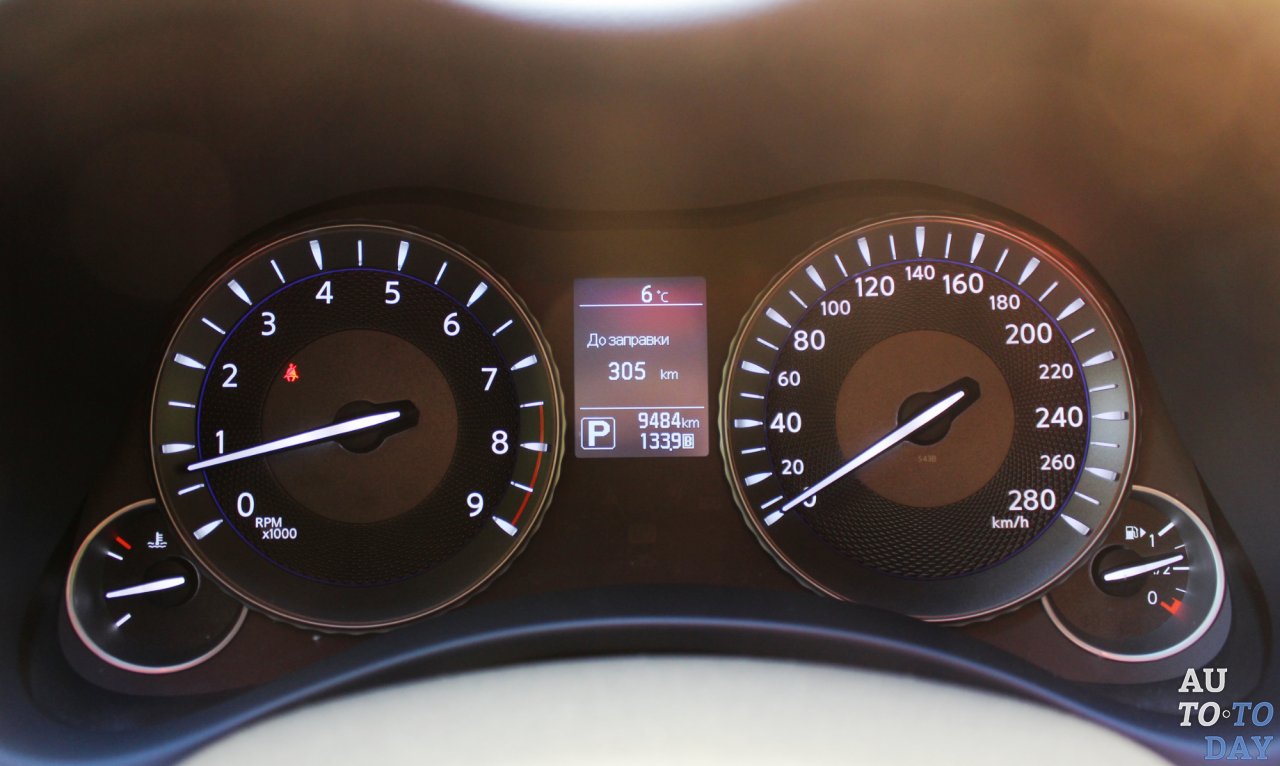 Рельефный руль снабжен большим количеством кнопок, к расположению которых нужно немного привыкать. Щиток приборов с приятной лунной подсветкой имеет интересную решетчатую фактуру шкал, крупные цифры, а также информативный черно-белый мониторчик борткомпьютера. Центральная консоль торпедо также кажется сначала перегруженной мелкими кнопочками. Но через два дня пользования машиной уже кажется, что все скомпоновано очень логично.