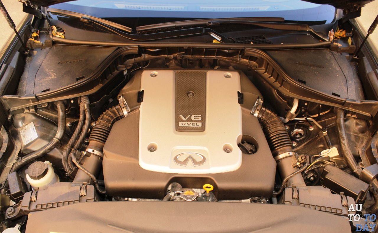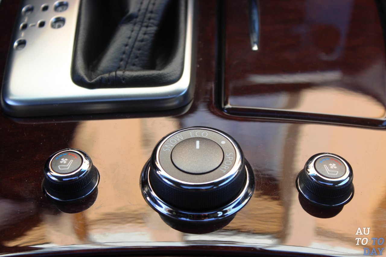 Герой нашего сегодняшнего теста оснащается 3,7-литровым бензиновым двигателем, 7-ступенчатой автоматической трансмиссией и системой полного привода. В пострестайлинговом исполнении V-образная «шестерка» развивает 333 л. с. мощности и 363 Нм максимального крутящего момента. Силовая установка имеет несколько режимов движения: «Снег», «Эко», «Стандарт» и «Спорт». В таком же порядке мы и пробовали их все. Конечно, зимний режим на деле испытать не удалось, но мы знаем, что в нем мотор держит максимально низкие обороты, трогается «в натяг», а при превышении скорости в 30-40 км/ч отключается.