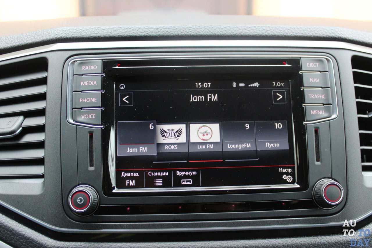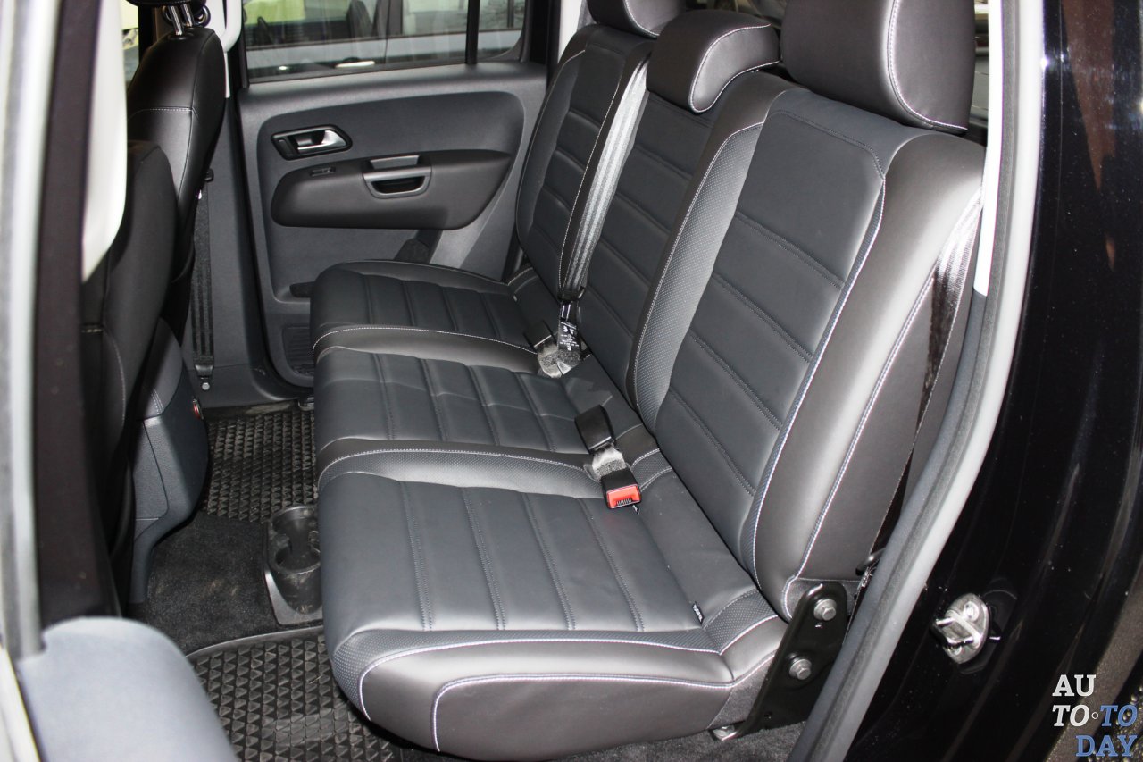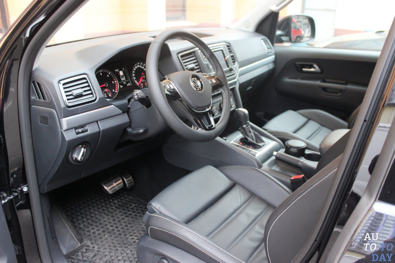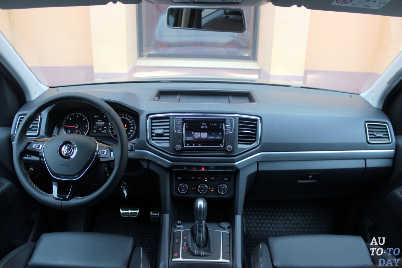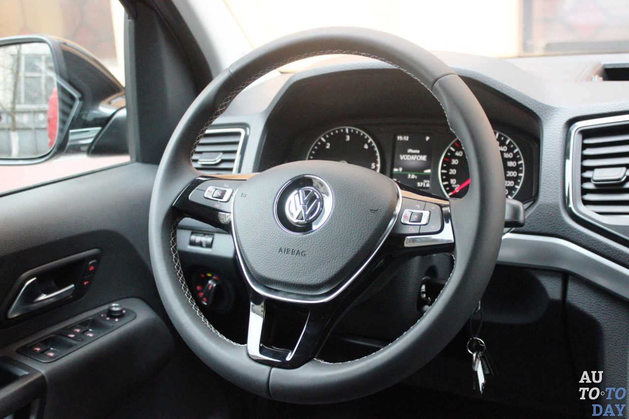 Покупатели первого Amarok жаловались на недостаточно комфортабельный салон, и в рестайлинговом пикапе эти пожелания учтены. Теперь отличить торпедо героя нашего теста от других крупных машин марки будет трудно. Передняя панель стала более угловатой, дефлекторы обдува получили более прямоугольную форму. Простоватая баранка уступила место удобному рулю, обшитому кожей и с приливами для пальцев в верхнем секторе. Кнопками на горизонтальных спицах можно управлять музыкой, подключенным телефоном и меню бортового компьютера.