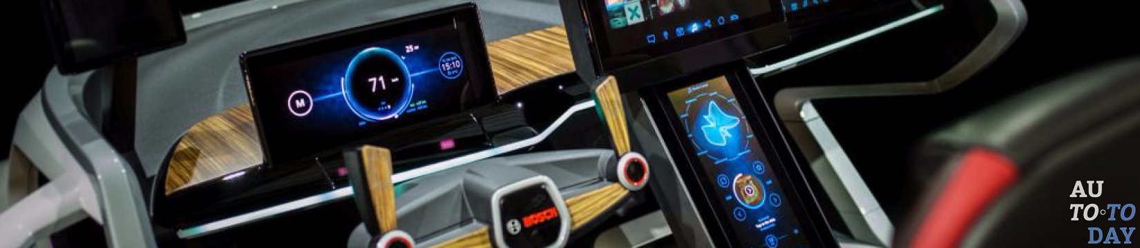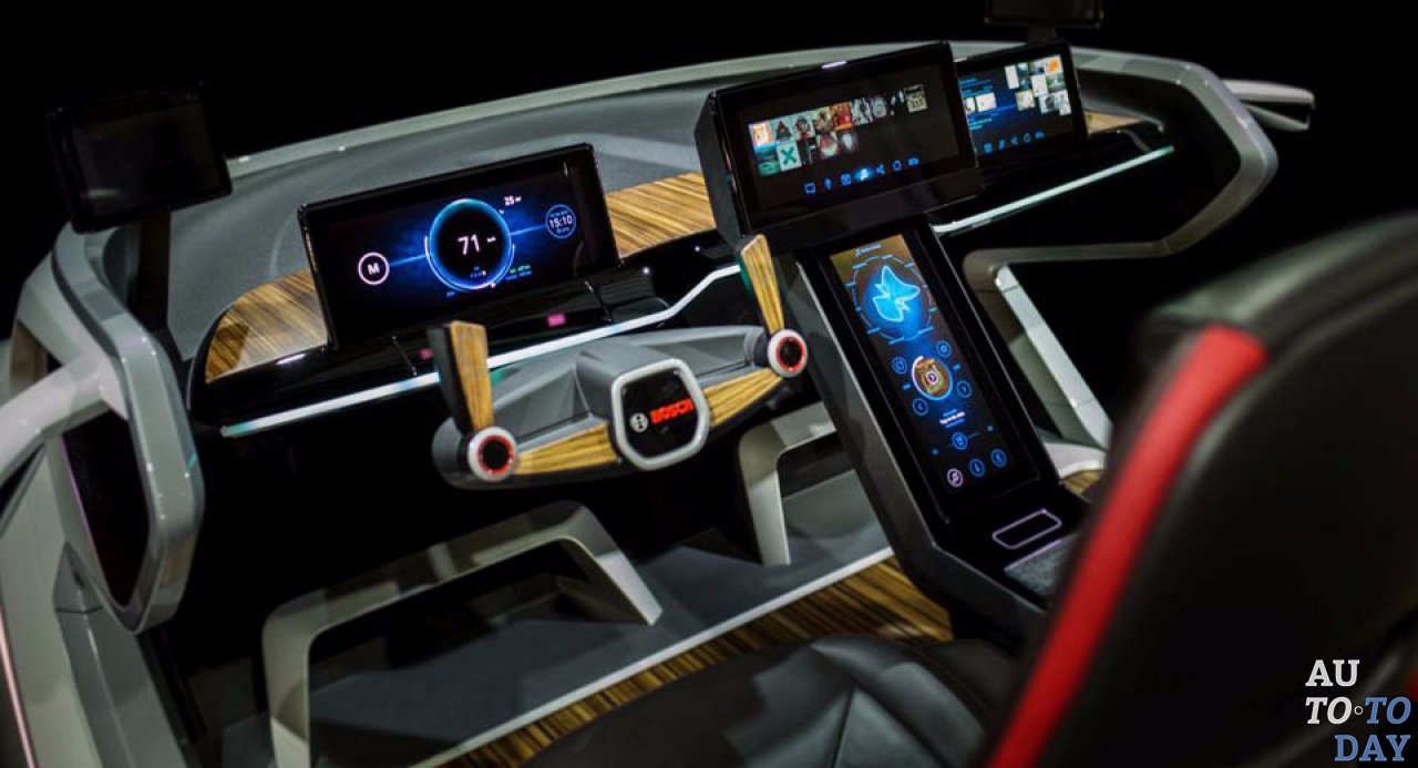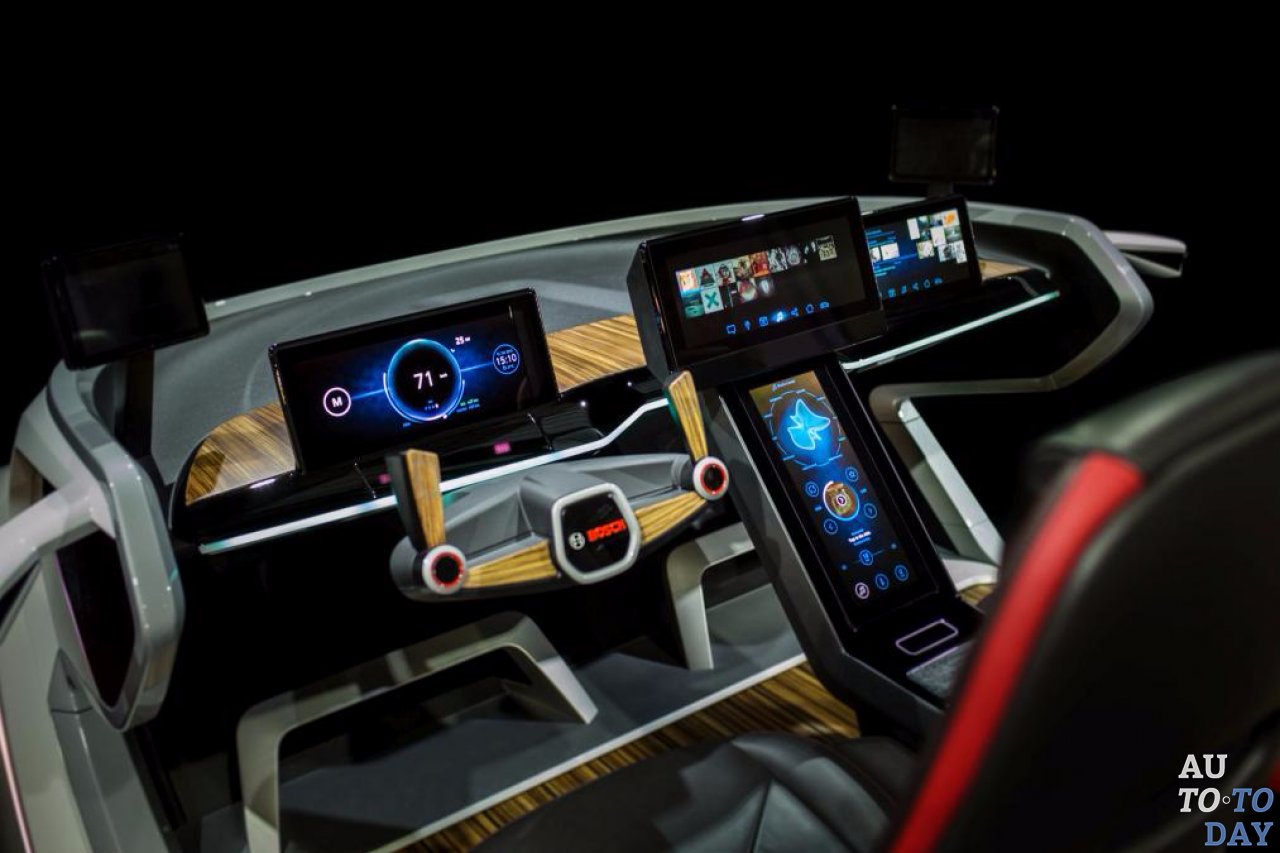 Так же, как и в прошлом году, Bosch представил впечатляющий концепт-кар на выставке CES, предложив захватывающий интерьер, груженный передовыми технологиями. Глядя на него, одним из наиболее интересных элементов является отсутствие традиционного рулевого колеса. На его месте находится руль с двумя ручками, отделанный деревом. Из-за отсутствия традиционного обода, водитель получает непрерывный вид на главный экран, который отображает всю жизненно важную информации о транспортном средстве.