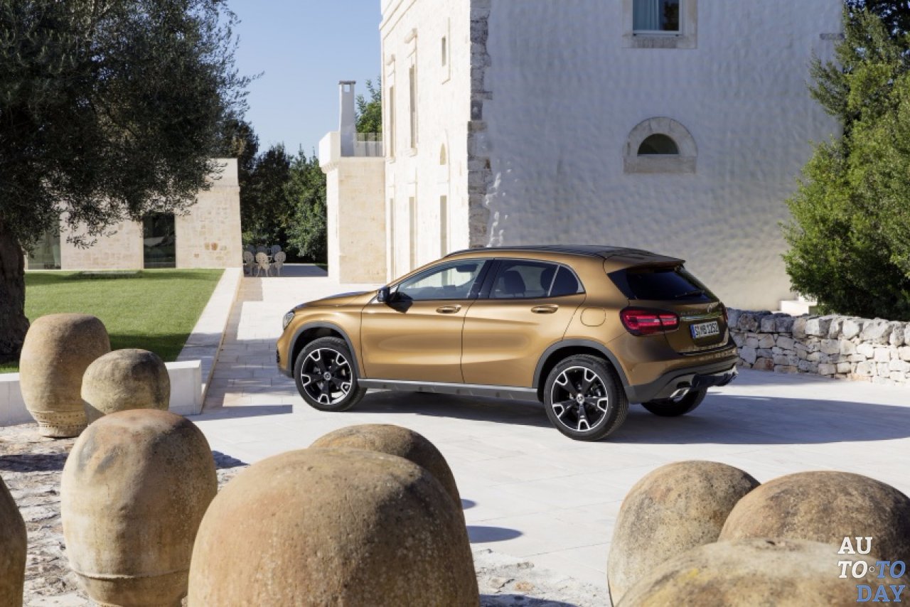 Передняя часть получила новый дизайн решетки радиатора с прямоугольными элементами, в то время как стали доступны светодиодные фары высокой эффективности. GLA также получил новый бампер, который заменил поддельные боковые воздухозаборники в пользу противотуманных фар, хотя пакет AMG Line вновь введен для тех, кто в нем заинтересован. Переработанная нижняя часть имеет такую же прямоугольную тему, как на решетке некоторых моделей, в то время как другие получили более выраженную защитную пластину вместо этого. Внизу по бокам все осталось, как раньше, а изменений в задней части не так много, как спереди. Задние фары получили различную графику, а также стали доступны дополнительные варианты колес на выбор.