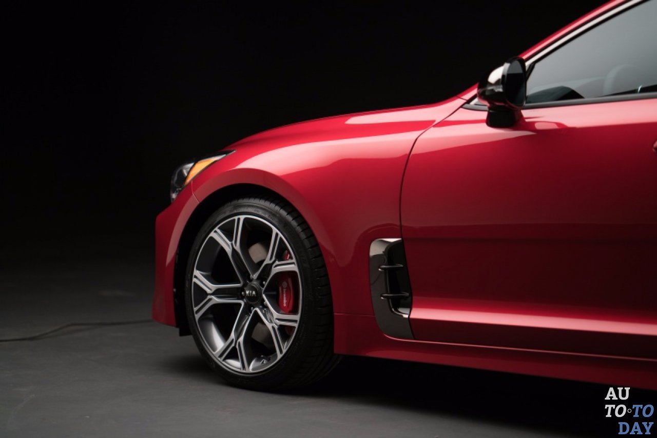Kia Stinger - это не серийная версия потрясающего концепта двухдверного спортивного автомобиля GT4 Stinger из Детройтского автосалона 2014 года, а скорее долгожданный дорожный четырехдверный заднеприводный шоу-кар Kia GT. Несмотря на шесть лет с момента первоначального дебюта в 2011 года на Франкфуртском автосалоне, Stinger сохраняет довольно много в конструкции, хотя некоторые детали немного переместились. Спереди, острые фары обрамляют "тигровую" решетку радиатора, но элементы, которые пронзают фары концепта были сделаны гораздо меньше и проще.