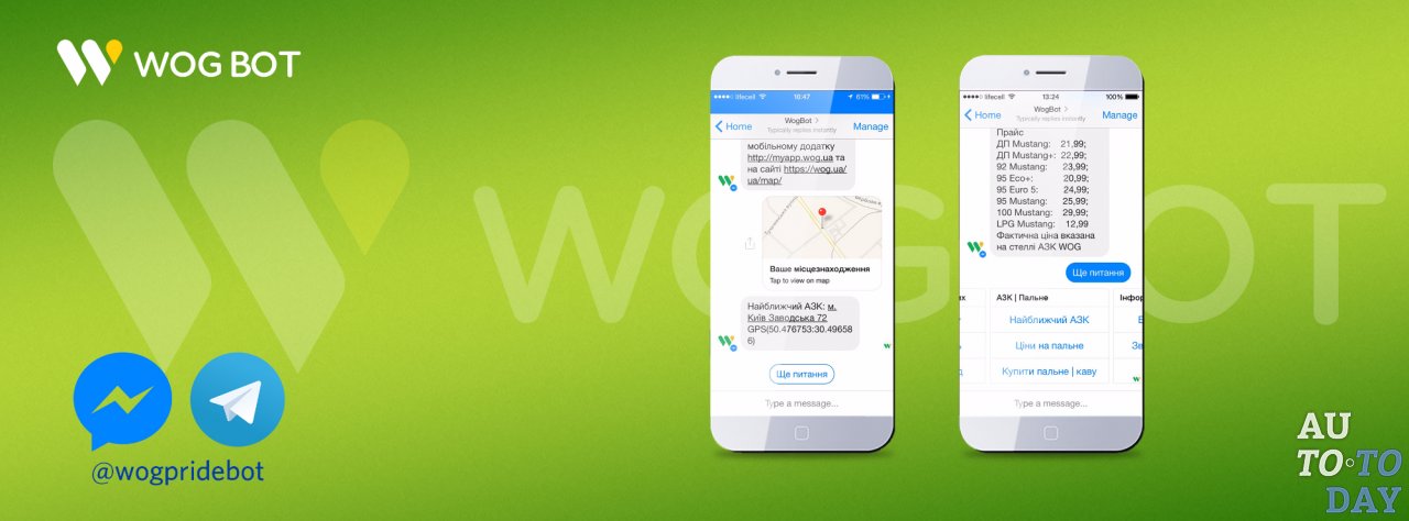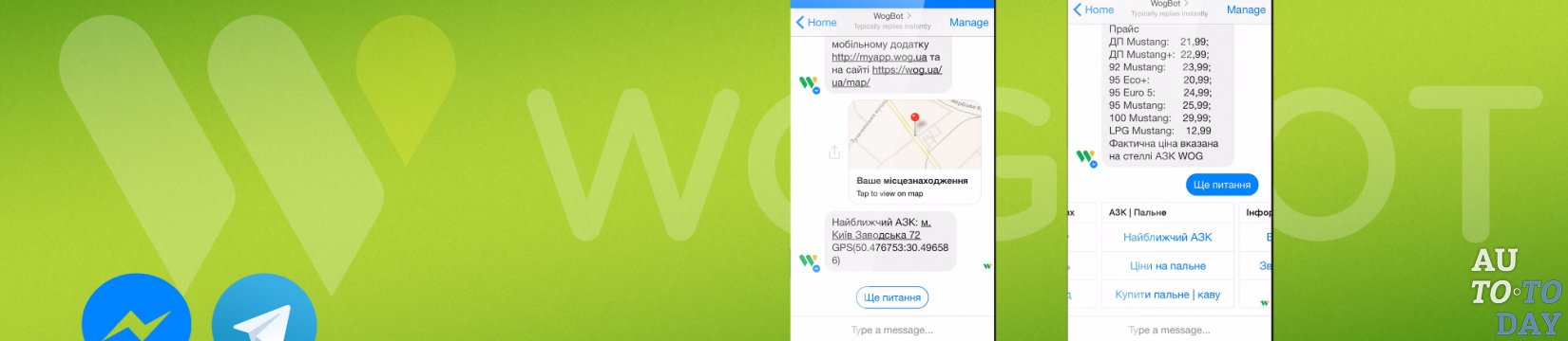 Компания WOG выпустила бота для пользователей мессенджеров Telegram и Facebook Messenger. Сейчас основные функции виртуального помощника WOG BOT - это: поиск ближайшего АЗК, информирование о ценах на топливо, а также содействие в работе с картой PRIDE и системой лояльности. А еще с помощью бота пользователи могут приобрести топливо или кофе заранее, что сэкономит их время на кассе.