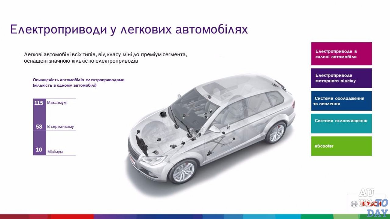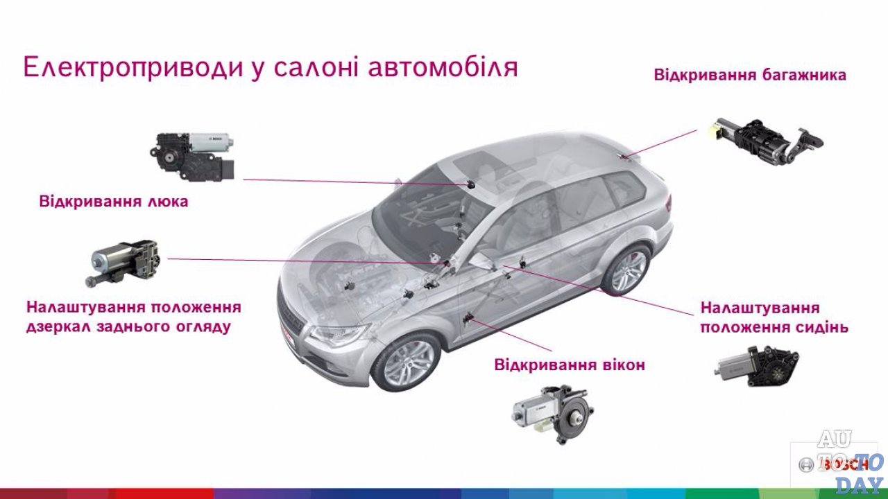 Современные автомобили становятся все более удобными: при нажатии лишь одной кнопки бесшумно открываются окна, люк на крыше и дверь багажника, включаются стеклоочистители, настраивается положение сидений, руля и зеркал заднего вида, создается оптимальная температура в салоне. Все эти функции обеспечивают маленькие помощники – электромоторы разной мощности, о существовании которых автомобилист порой и не задумывается. Между тем, в каждом автомобиле работает от 10 до 115 электроприводов. Легкие, компактные моторы действуют быстро и бесшумно. Компания Bosch, как ведущий разработчик и инноватор в области электрики и электроники для автомобилей, уже более 100 лет производит электроприводы для широкого спектра транспортных средств, от спортивных моделей до тяжелой спецтехники. Они установлены в легковых, грузовых автомобилях, микроавтобусах, моделях класса «люкс». Электромоторами Bosch оснащаются также такие экологичные транспортные средства, как eScooters и eBikes.