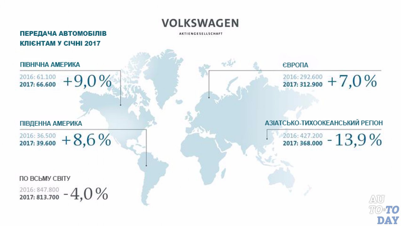 В январе концерн Volkswagen передал своим клиентам 813 700 автомобилей по всему миру. Фред Капплер, руководитель направления продаж Volkswagen Aktiengesellschaft, прокомментировал январские показатели: «В сравнении со значительным ростом в прошлом году, в начале этого года объем продаж в Китае испытал влияние определенных факторов. Главным образом, это произошло в связи с ранней датой наступления нового года по китайскому календарю, налогов на автомобили с маленьким объемом двигателей, а также в связи с временным ограничением планирования производства дилеров Audi. По нашему мнению, в этом году мы можем ожидать интенсивного роста в Китае». Капплер добавил: «За исключением Китая концерну удалось достичь значительного роста в 4,9% на рынках по всему миру».