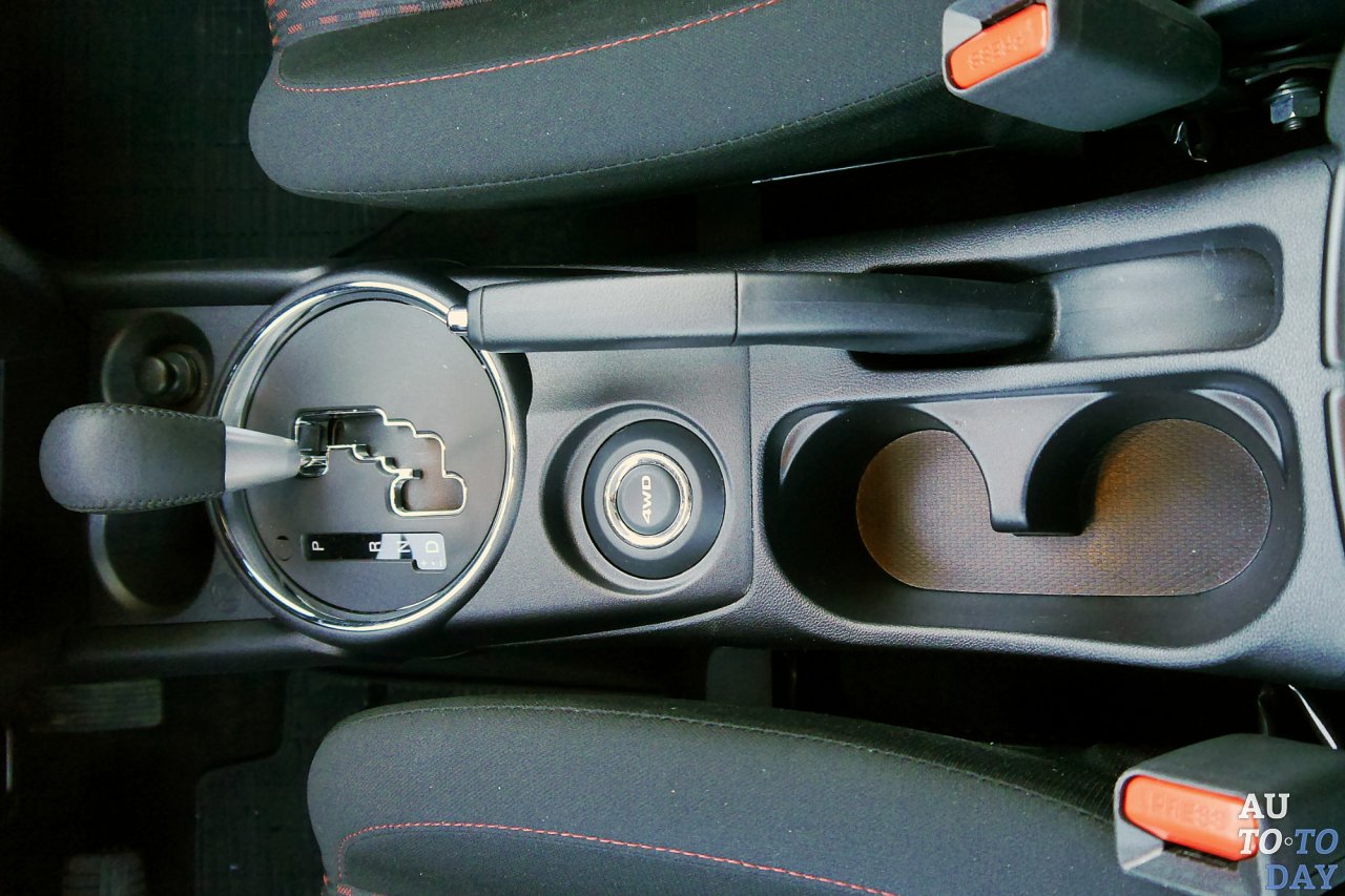 Возле рычага КПП - кнопка управления полным приводом и сдвоенный подстаканник.