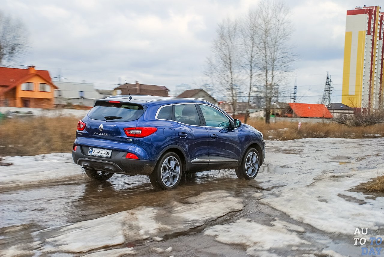 Номерной знак и нижняя губа бампера первыми вступят в контакт с бордюрами при неаккуратной парковке, хотя с передним парктроником для этого еще нужно постараться. Глубокие 20-сантиметровые ямы, которые мы «нашли» в одном из спальных районов Киева, переднему свесу этого француза тоже не рекомендованы. Углы въезда и съезда составляют 18 и 28 градусов соответственно, что не слишком благоприятствует хорошей геометрической проходимости. К счастью, упомянутая губа, как и пороги с колесными арками, защищены неокрашенным пластиком. А вот дорожный просвет хорош, 200 мм – весомый показатель по меркам класса. Хоть наш переднеприводный Kadjar больше любит город, он не спасует перед раскатанной колеей на размытой «грунтовке» при возвращении, скажем, с пикника домой.