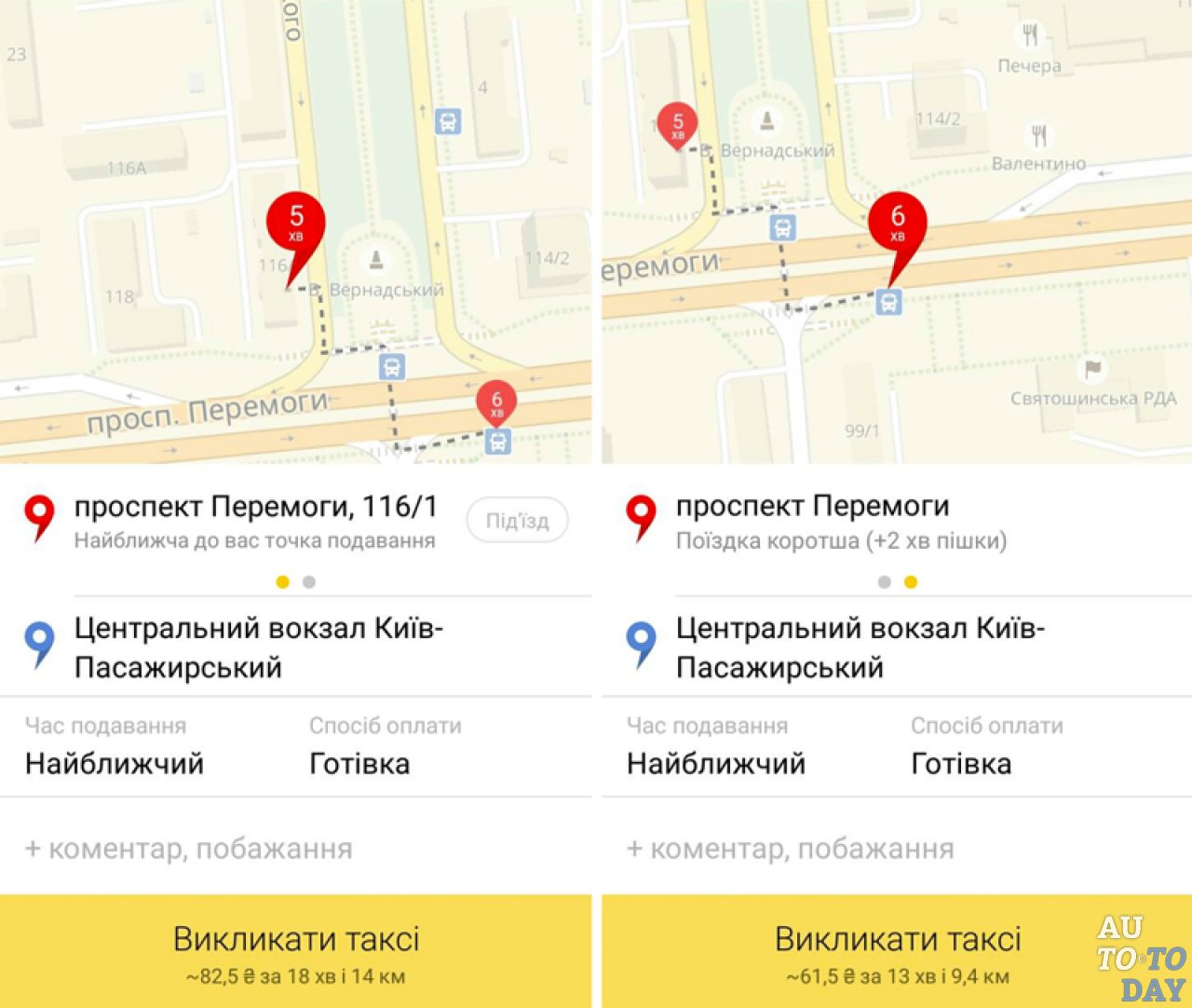 При вызове такси минута-другая пешком может сэкономить время, а заодно и сократить стоимость поездки. Стоит перейти дорогу или железнодорожные пути — и машина приедет раньше или быстрее довезёт до нужного места, потому что водителю не придётся делать крюк для разворота. Например, если вызвать такси в Киеве у памятника Вернадскому на проспекте Победы, то до Центрального вокзала можно доехать приблизительно за 18 минут. Однако стоит пересечь проспект по подземному переходу – и время в пути сократится на 5 минут. Такая поездка выйдет примерно на 20 гривен дешевле.