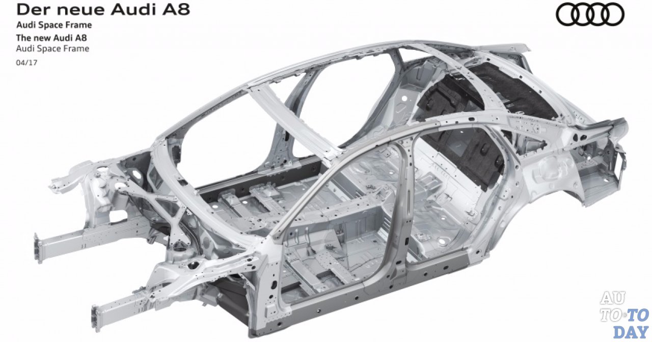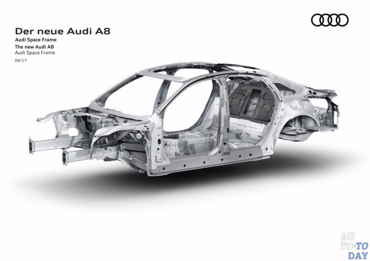 Audi выпустил некоторые предварительные детали своего следующего поколения A8 (D5), сосредотачиваясь на структуре кузова седана и его многоматериальной конструкции. Как стандартная, так и длинная колесная база A8 (так называемая A8 L) будет построена на Audi Space Frame (ASF), в которой используется смесь из алюминия, стали, магния и углепластика (CFRP) для обеспечения оптимальной жесткости и прочности. Следуя принципу компании «правильный материал в нужном месте и в нужном количестве», задняя панель изготовлена из 6-19 слоев углепластика, расположенных один на другом.
