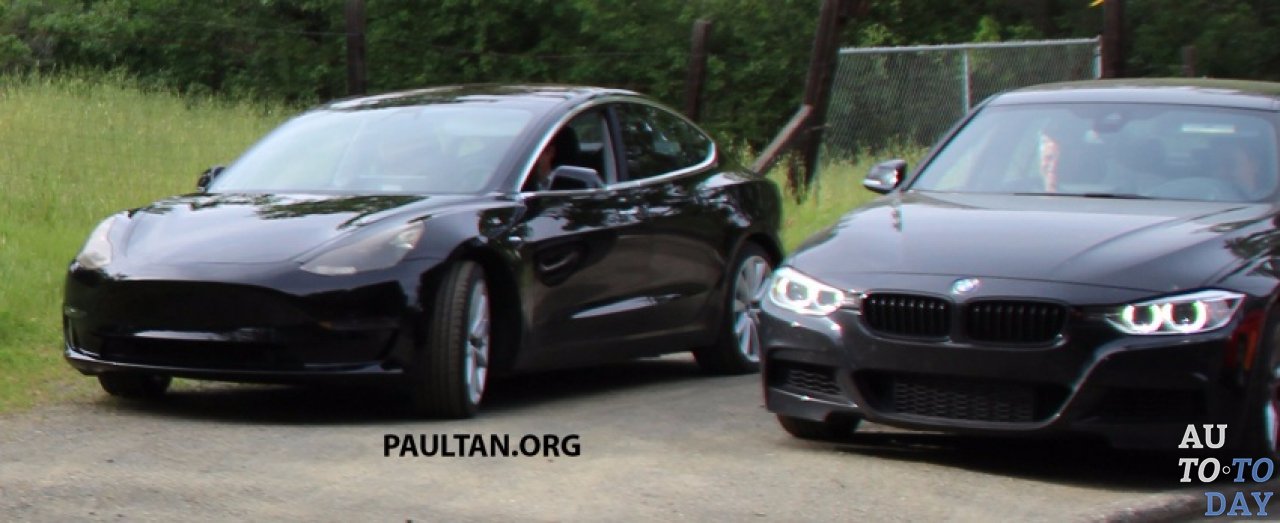 Как было указано ранее, Model 3 не получит традиционную комбинацию приборов, вместо этого вся информация об авто будет отображаться на большом центрально смонтированном дисплее, как в Model S. Генеральный директор Tesla ответил по этому поводу: «Чем более автономный автомобиль, тем меньше информации вам нужно. Как часто вы смотрите на приборную панель во время езды на такси?» Также на снимках вместе с Model 3 можно увидеть BMW F30 3 Series, возможно, для целей перенятия опыта. Это их не первая встреча, тем не менее, BMW выпустил видео, где высмеивается долгое ожидание клиентов Tesla, причем 330e играет свою роль электрифицированного автомобиля уже в продаже.