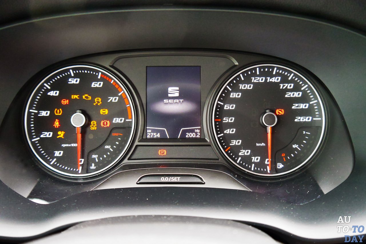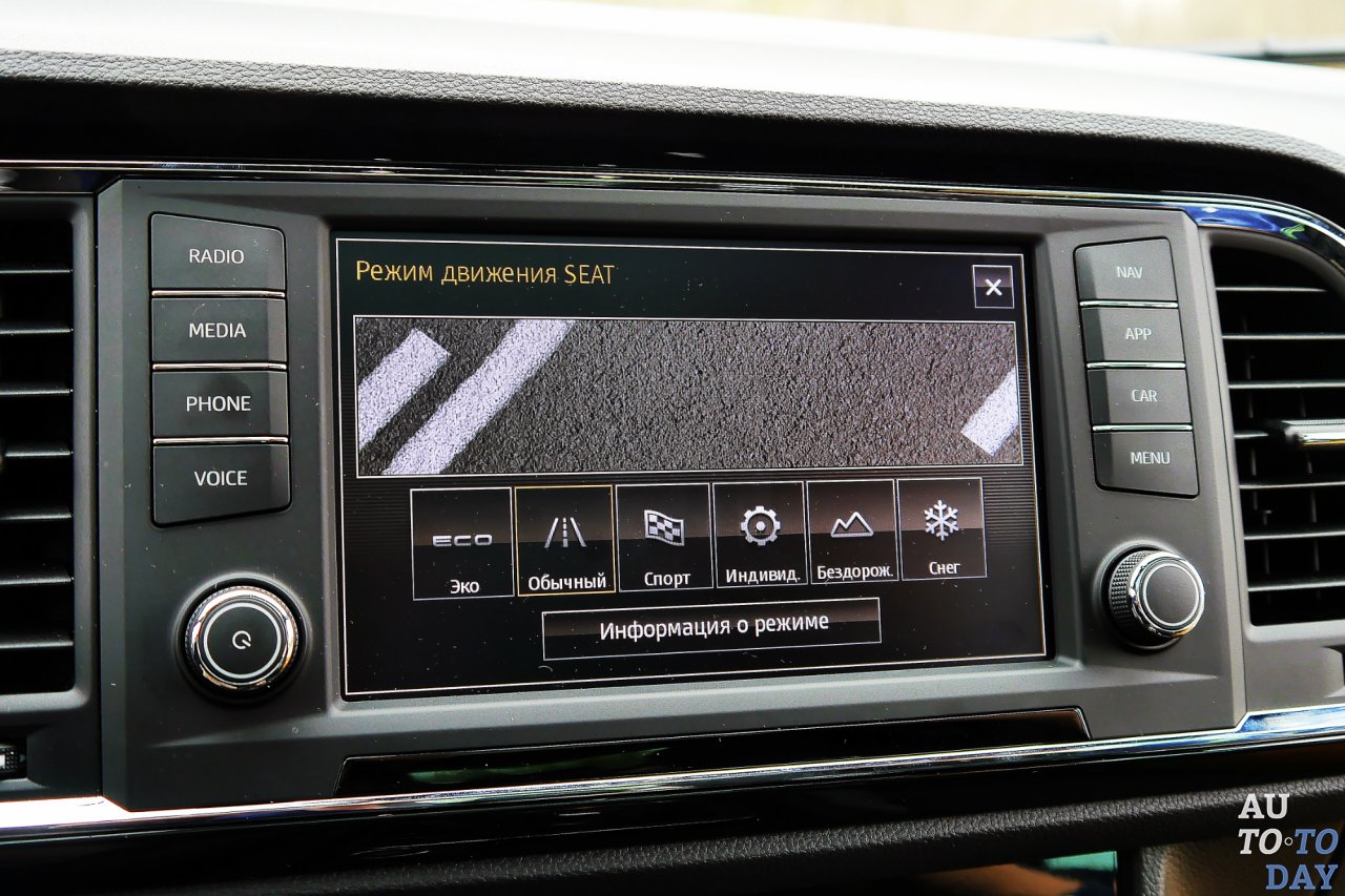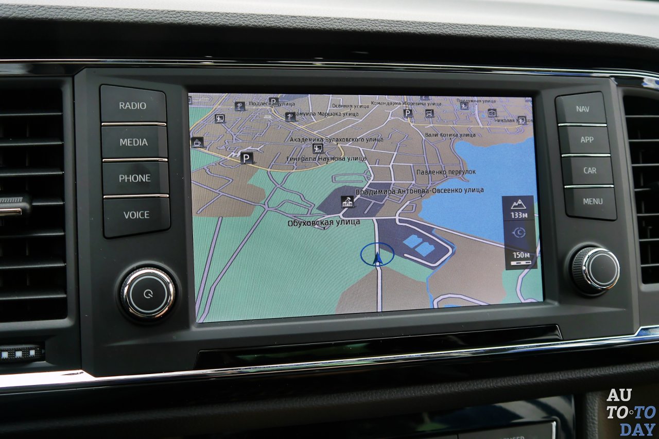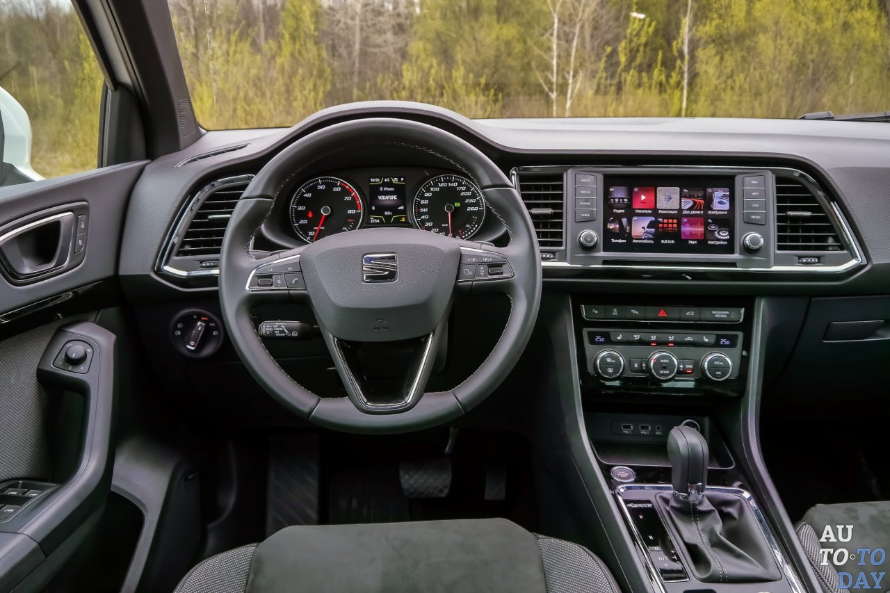 Но «Сеат» может не только развлекаться. Система кругового обзора с четырьмя камерами позволяет переключаться между ними при маневрировании, по умолчанию выводя картинку с камеры заднего вида. Кстати, в топовой комплектации последняя даже снабжена отдельной форсункой омывателя! Ориентированное к водителю торпедо выполнено из микса твердого и мягкого пластиков (последний, к сожалению, не находит продолжения на дверных панелях), удобный руль малого диаметра обтянут кожей.