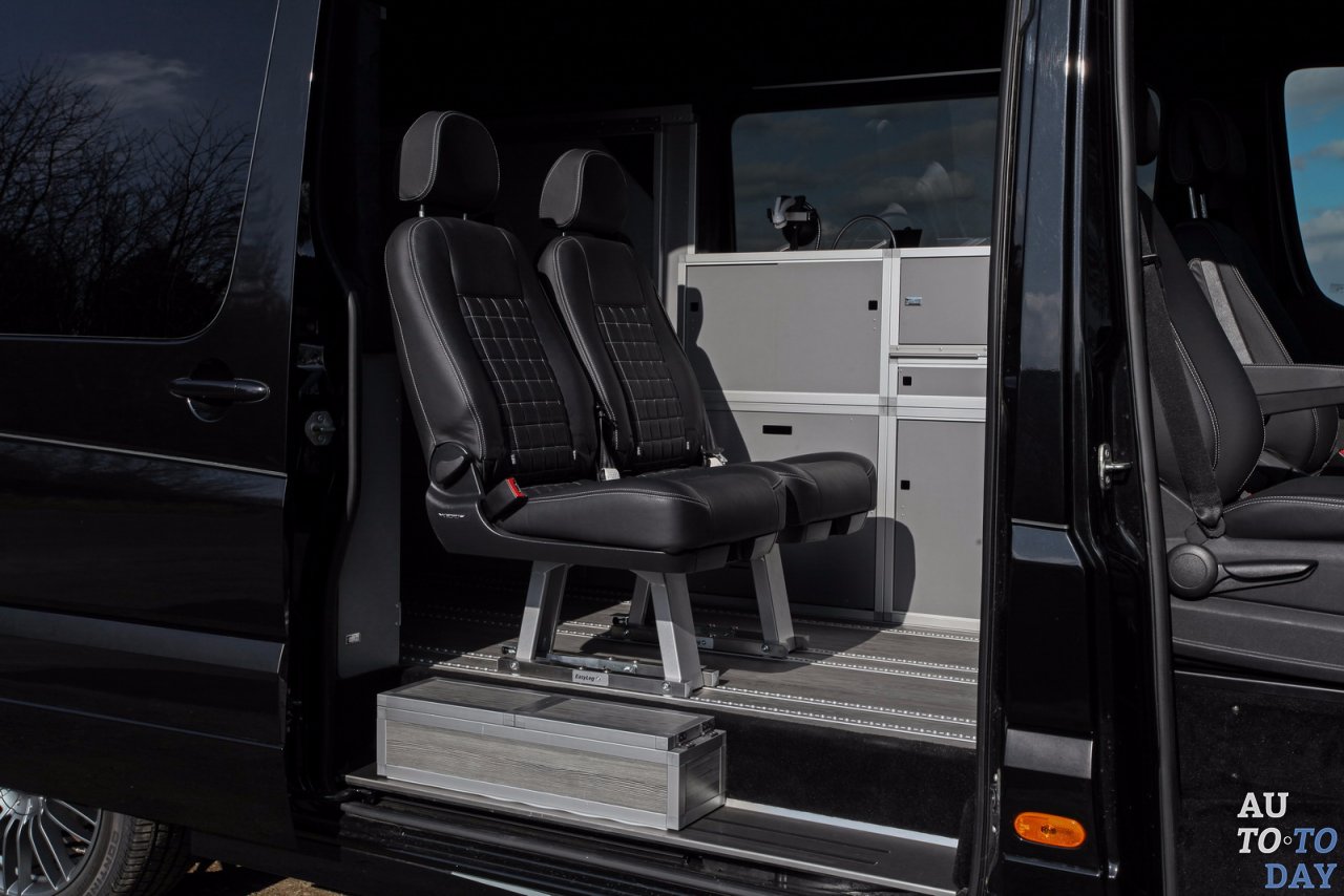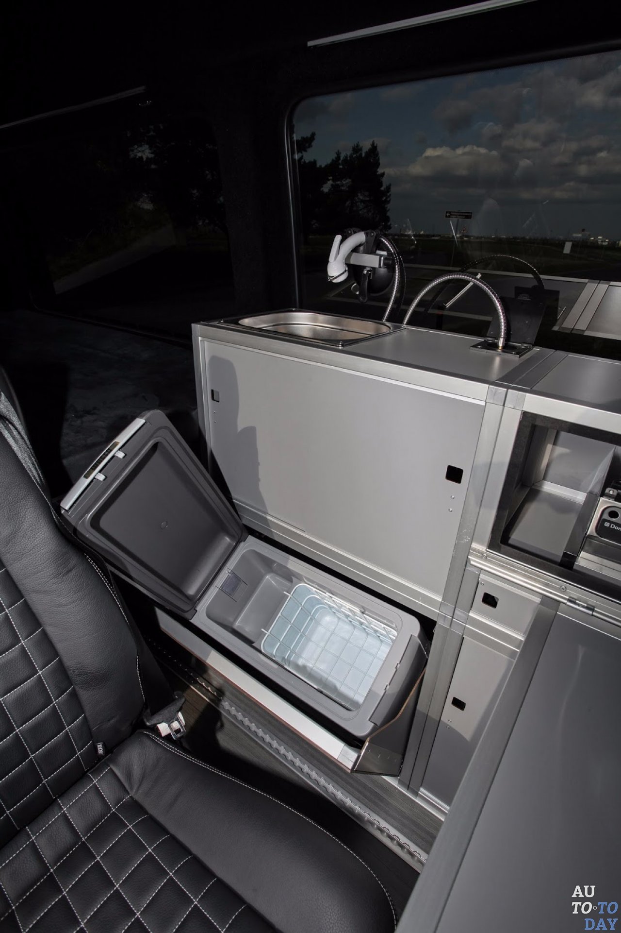 Мебель для кемпинга, которая включает 12-литровую раковину, спиртовую печь с двумя конфорками, холодильник, боковые панели, складной стол и раскладные кровати, можно снять в любое время. Внешнее подключение к 230 Вт, внутренний сплиттер на 12 Вт, светодиодная подсветка в салоне и дополнительная батарея обязательно пригодятся во время похода.