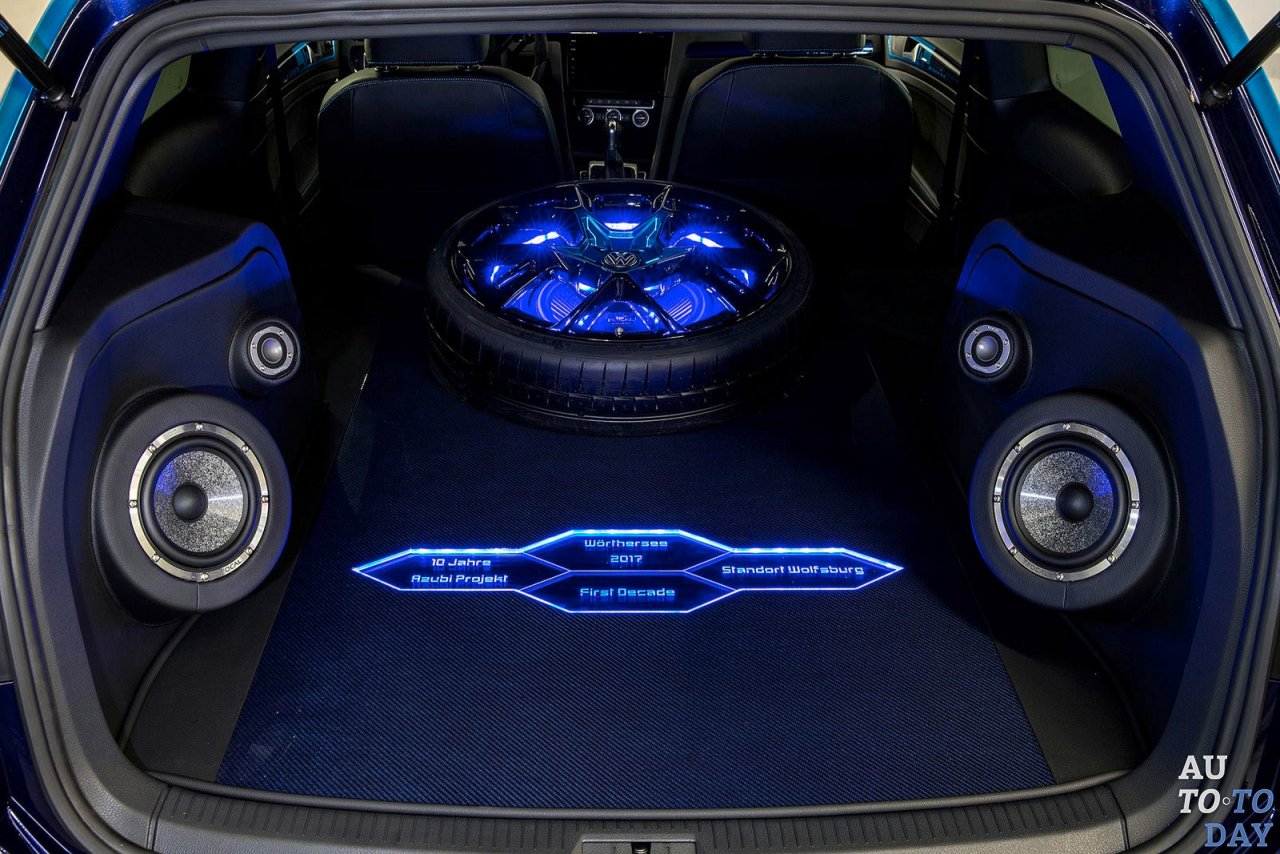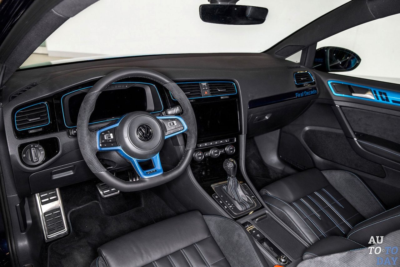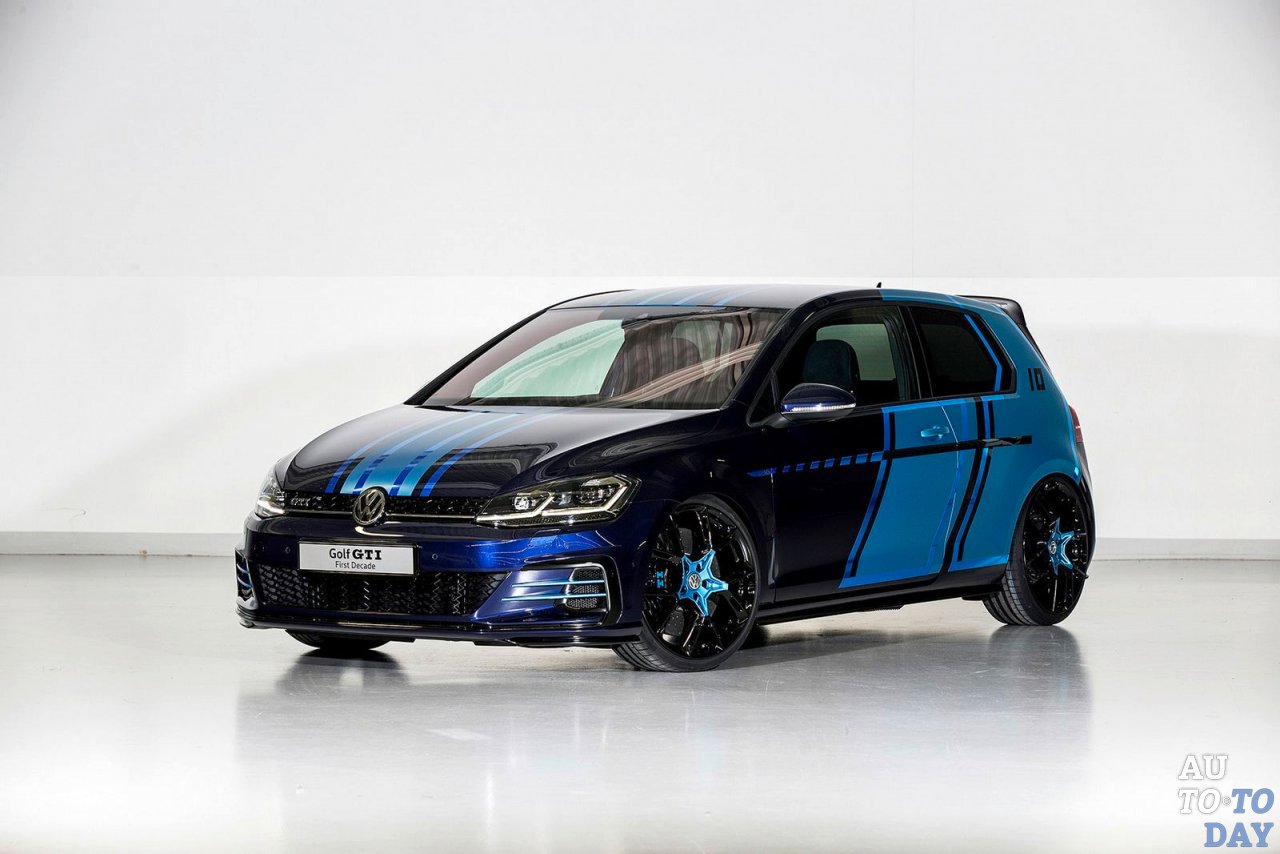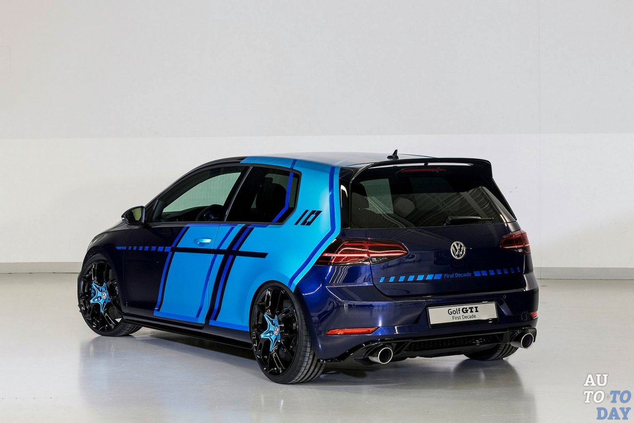 Чтобы зарядить две батареи в задней части хэтчбека, 13 учеников Volkswagen разработали регенеративную тормозную систему. Визуально Golf GTI First Decade выделяется благодаря темно-синей и светло-голубой ливрее, черным и синим колесам, заднему спойлеру GTI Clubsport и ряду значков с надписью «Первое десятилетие» и «10». В салоне также можно найти синюю отделку, а также аудиосистему с 11 динамиками и сабвуфером.
