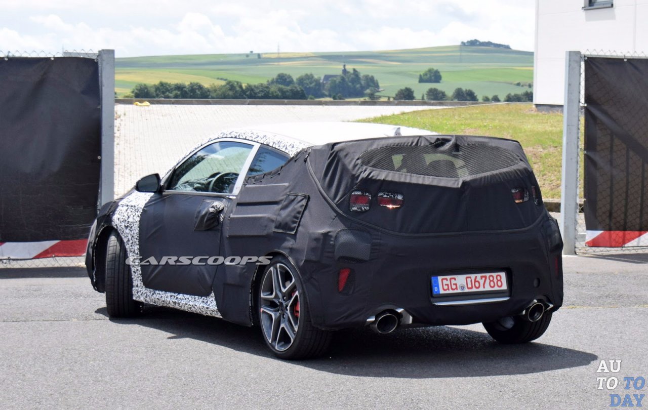 С самого начала, такие функции, как большие колеса и тормоза, опускающаяся подвеска и массивные выхлопные трубы говорят нам, что это не просто обычный Veloster, скрывающийся под всем этим тяжелым камуфляжем.