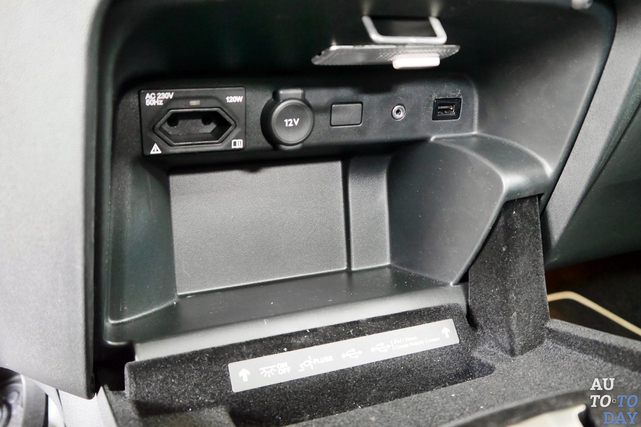 На месте центральной консоли расположен целый блок розеток и подставка для зарядки планшета.