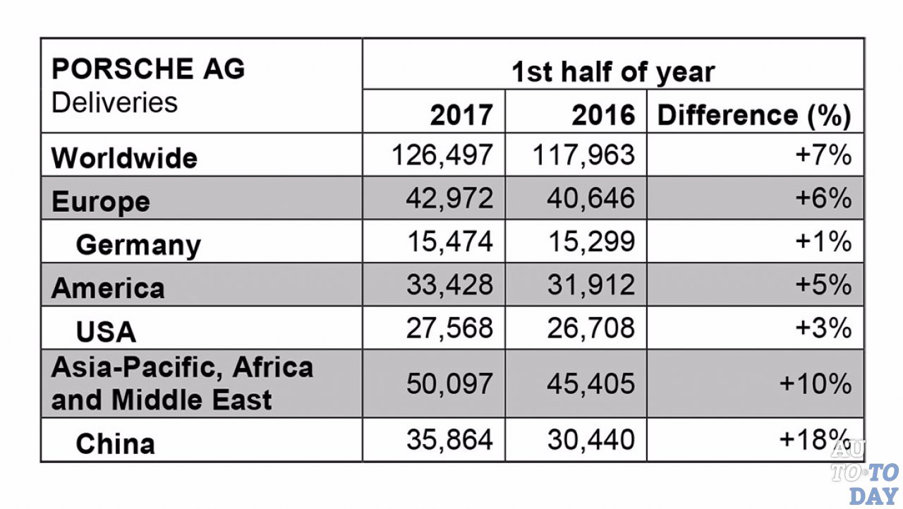 Азиатско-Тихоокеанский регион, Африка и Ближний Восток были крупнейшими рынками Porsche в первой половине 2017 года, с 50 097 продаж и общим ростом на 10 процентов, из которых 35 864 были отправлены в Китай, что на 18 процентов больше по сравнению с прошлым годом.