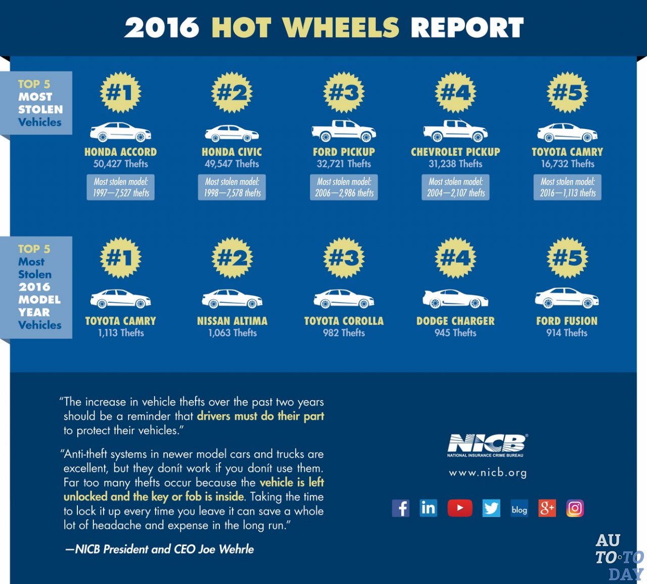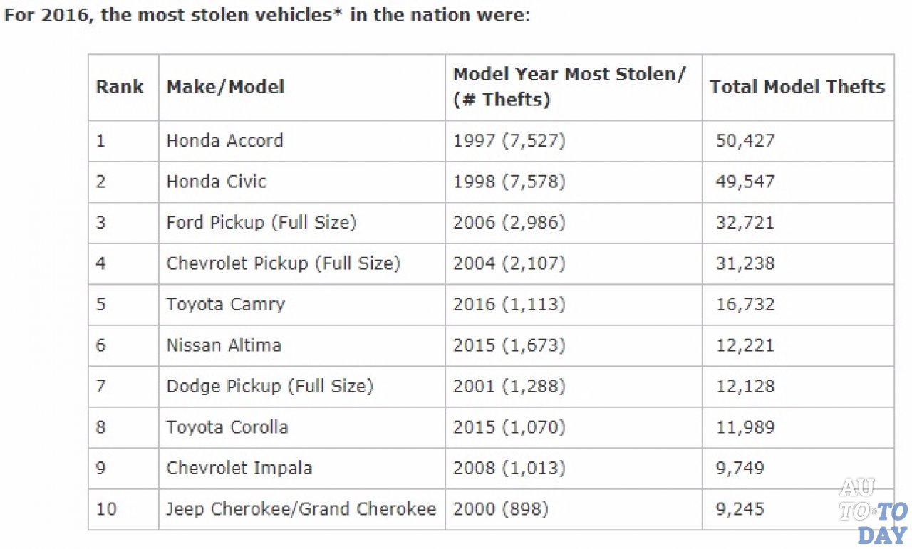 Используя данные из Национального информационного центра по борьбе с преступностью, в докладе показано, что автомобилем, который наиболее часто воруют в Соединенных Штатах в прошлом году был Honda Accord. За ним последовали Honda Civic с 49 547 сообщениями о краже.